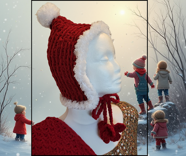 Diese kuschelige Santa-Claus-Kindermütze (tunesisch gehäkelt) macht sofort Festlaune: rotes Rechteck, weiße Blende, Blüte & Kordeln – fertig zum Strahlen. Ideal für Anfänger im tunesischen Häkeln.