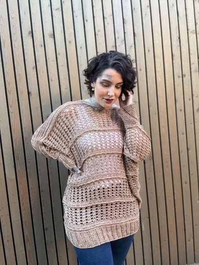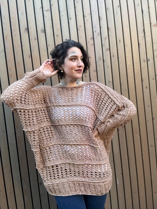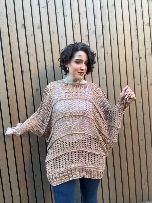 Der Glamour Coffeegirl wird komplett in einem Stück von unten nach oben gearbeitet. Keine Nähte, keine getrennten Teile, keine zusätzlichen Bobbel für die Ärmel. Alles entsteht fließend, Masche für Masche, bis der Pulli in seinem eleganten Fledermausschnitt Gestalt annimmt.
