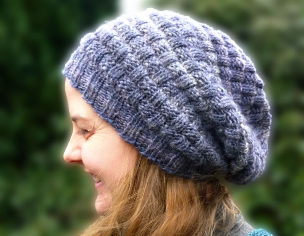 Diese Mützenanleitung im Korbflechtmuster ist in der modisch weiten „Beanie“ Form. Das Muster ist ein Wendemuster, es sieht von beiden Seiten toll aus.