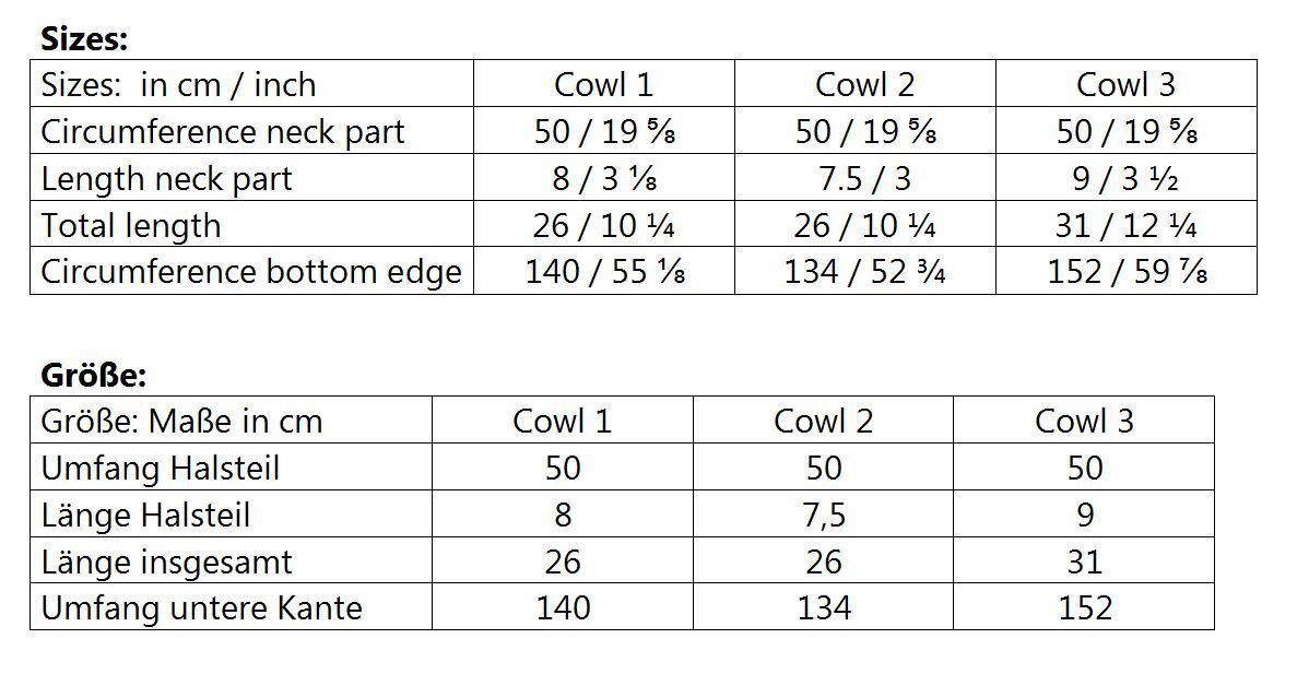 Anleitung enthält 3 Beispiele für Cowl mit Nadelstärke 6, 9 und 12 mm.