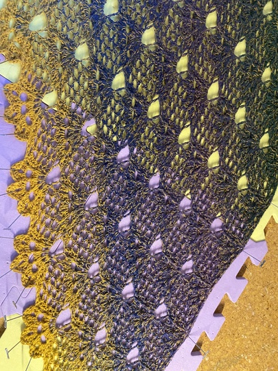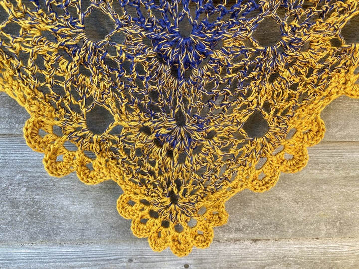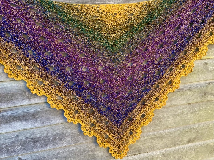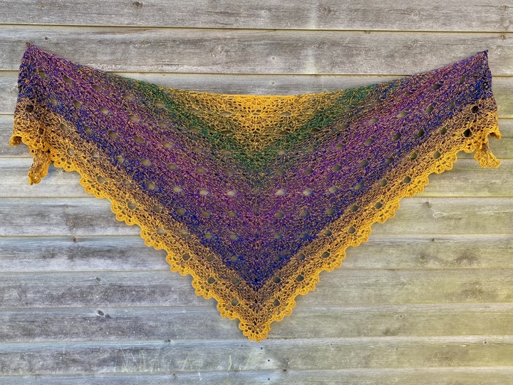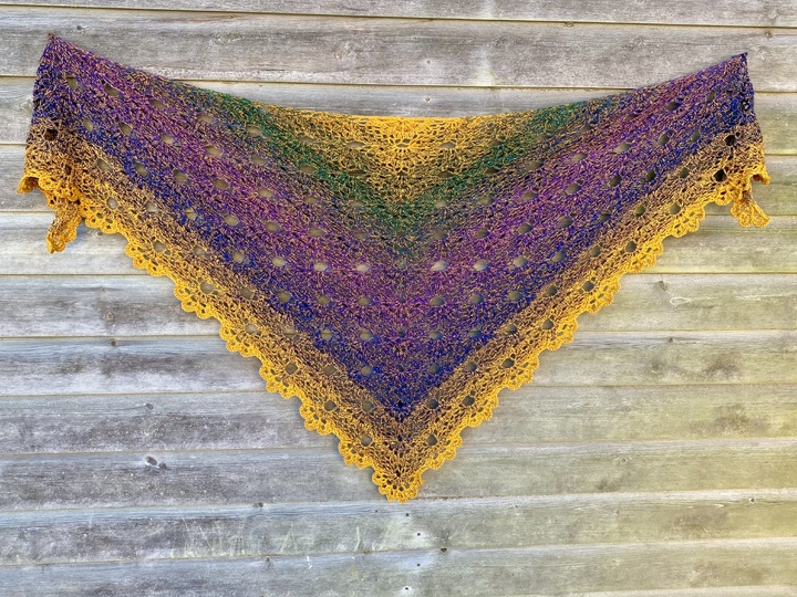 Das Muster lässt sich endlos fortsetzen, weshalb das Tuch sowohl als luftiger Schal, als auch größeres Schultertuch in allen Größen gearbeitet und getragen werden kann.