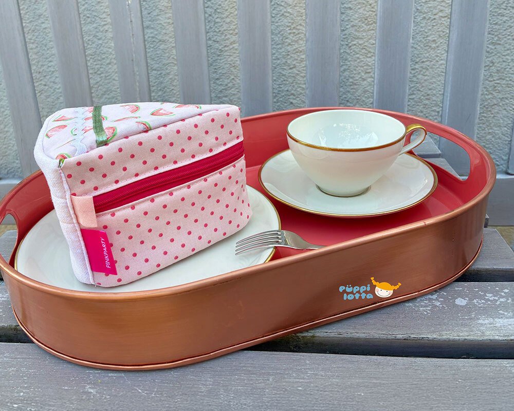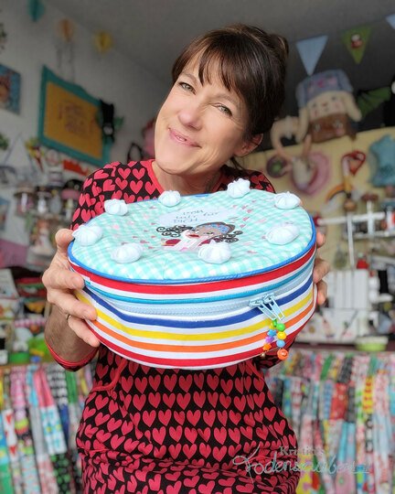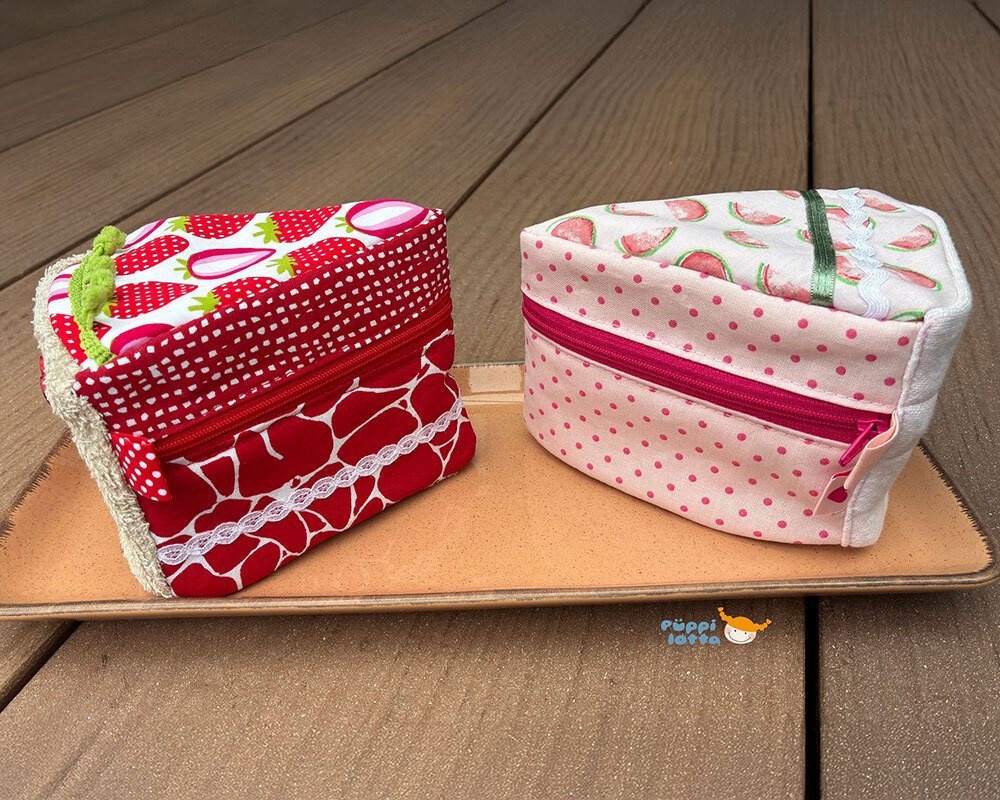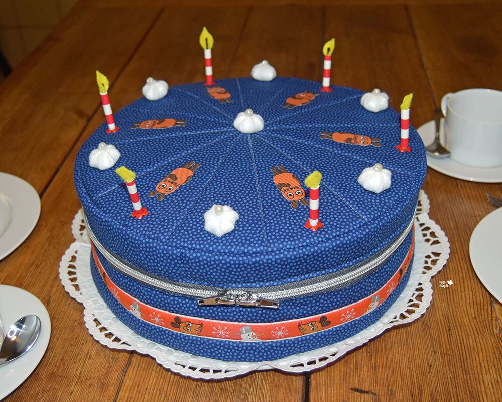 Nähanleitung und Schnittmuster gestaltet als PDF-E-Book für einen multifunktionalen Kuchen aus Stoff mit Reißverschlusstasche.