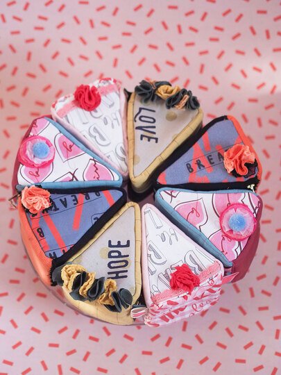 Besondere Materialien, Stoffe, Tüddel, Knöpfe, Borten und Bänder finden in diesem Kuchen aus Stoff einen Platz.