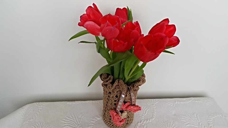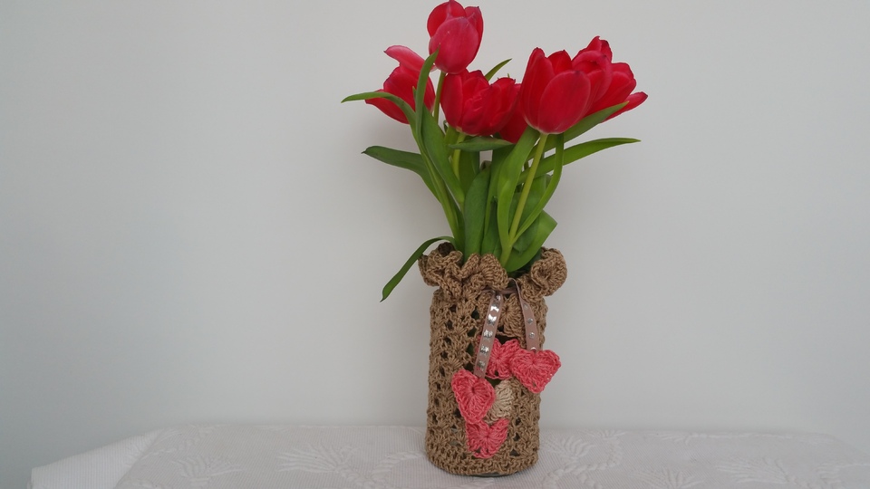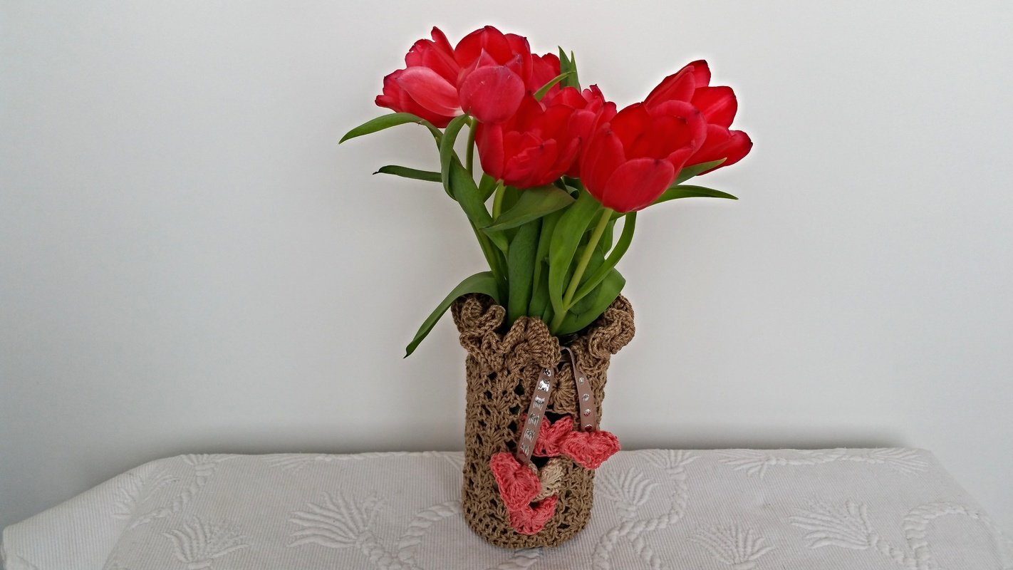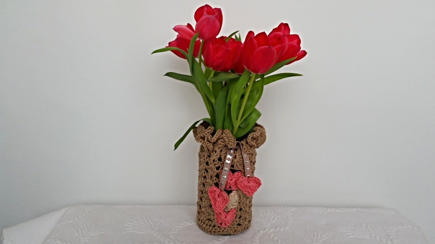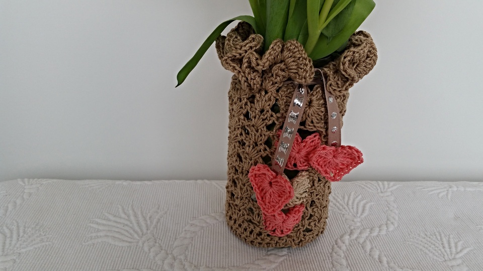 Die Größe lässt sich individuell anpassen.Wir umhäkeln einfach unsere Vase oder unser Glas ,wir können es nun als Windlicht oder weiterhin als Vase verwenden .