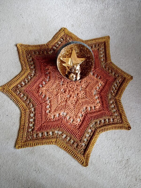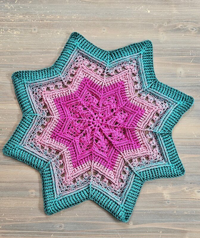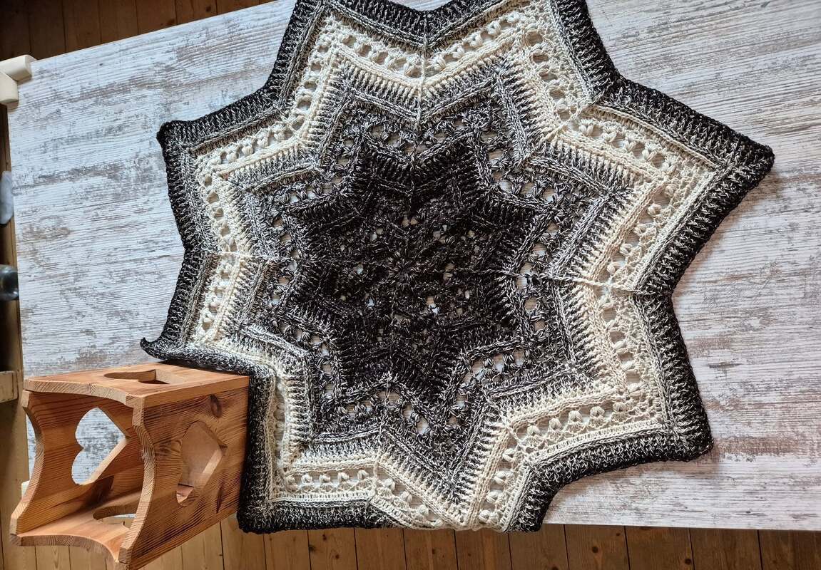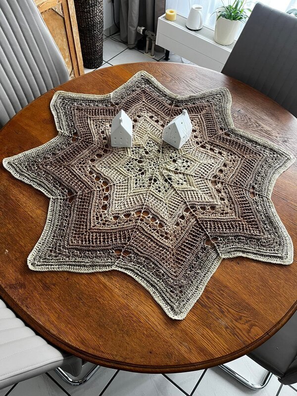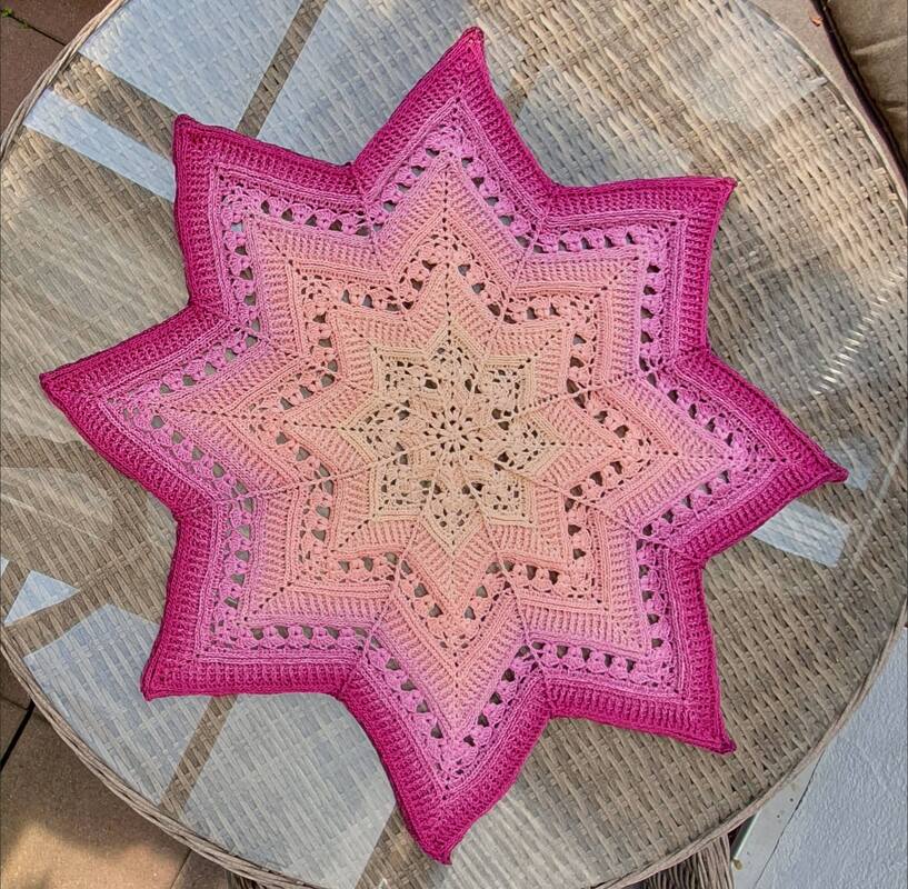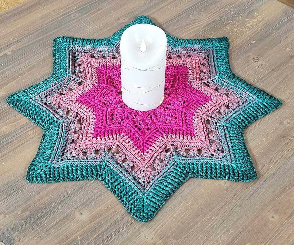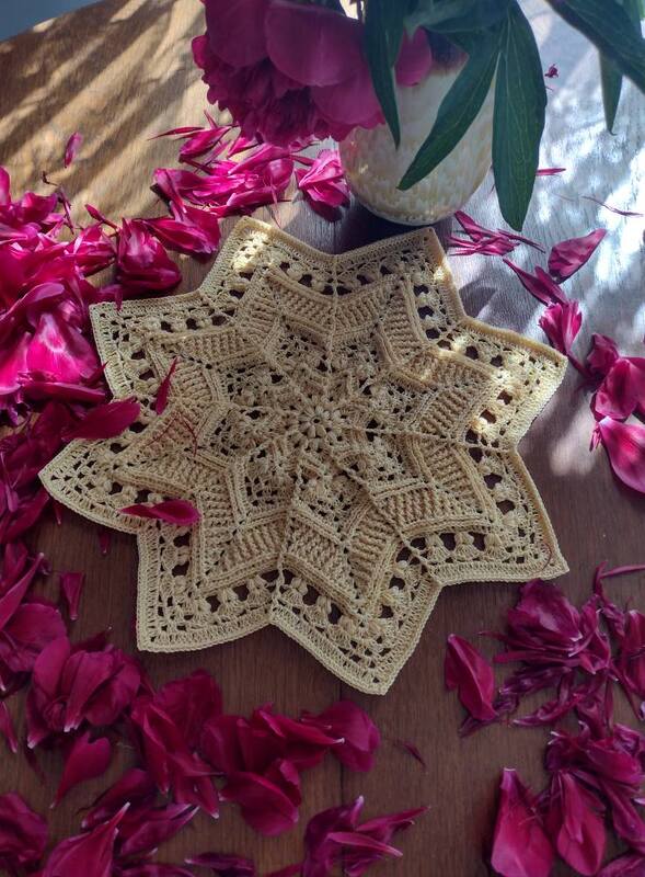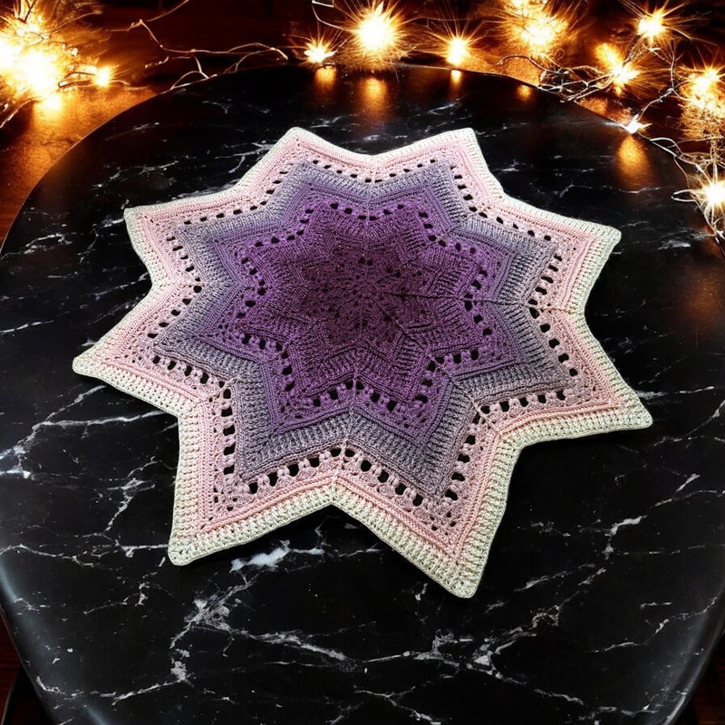 Astraia ist ein zauberhaftes Deckchen in Sternenform, das in jeder beliebigen Größe gehäkelt werden kann, da sich die Reihen wiederholen.