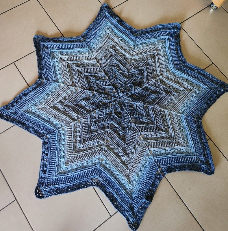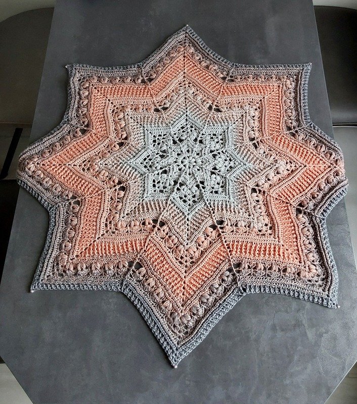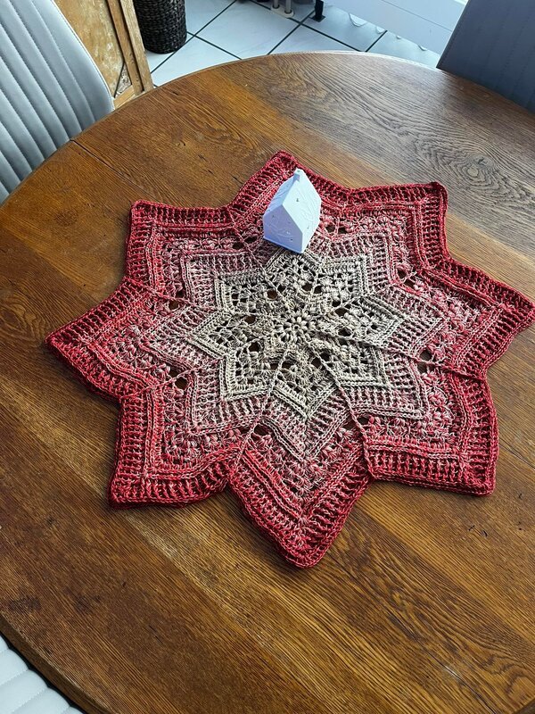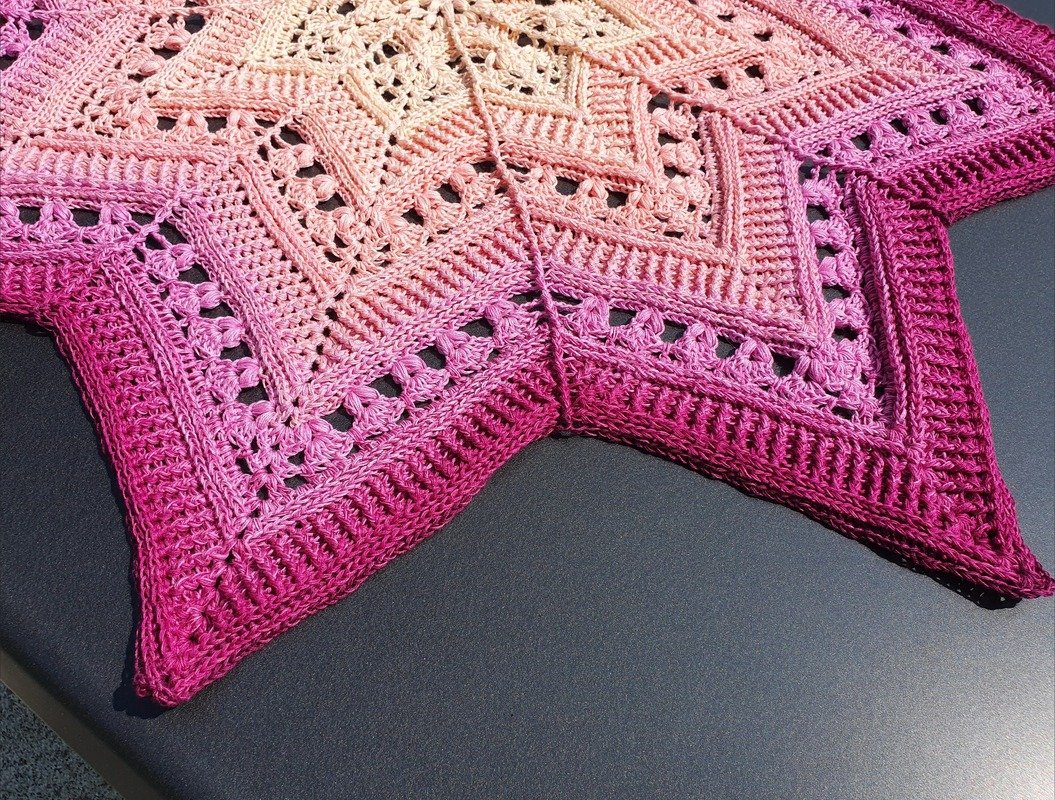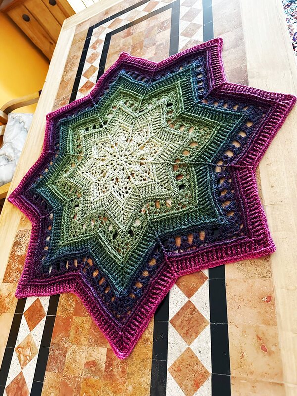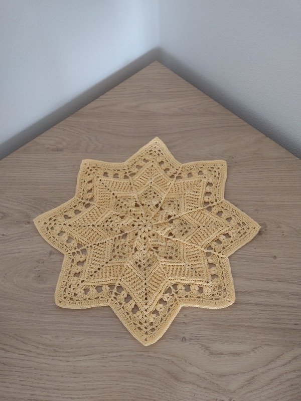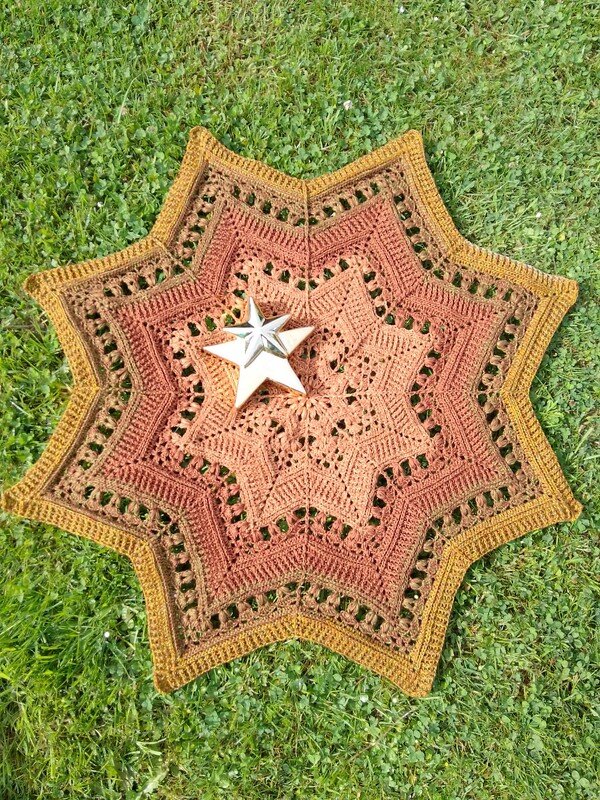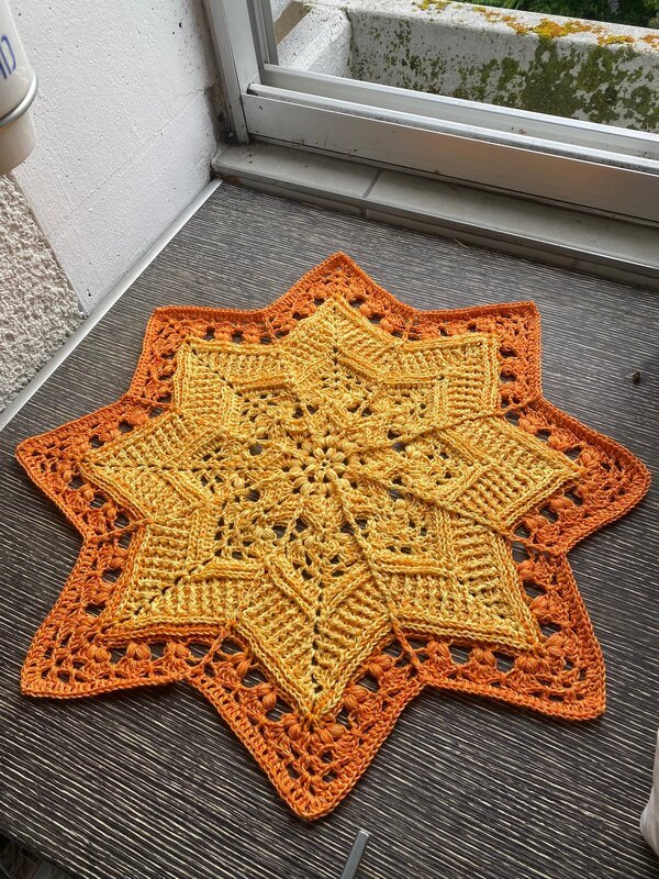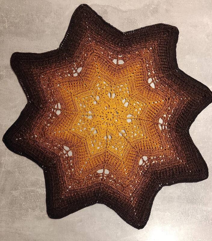 Astraia ist ein zauberhaftes Deckchen in Sternenform, das in jeder beliebigen Größe gehäkelt werden kann, da sich die Reihen wiederholen.