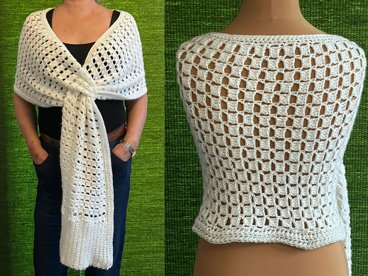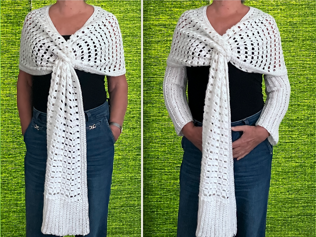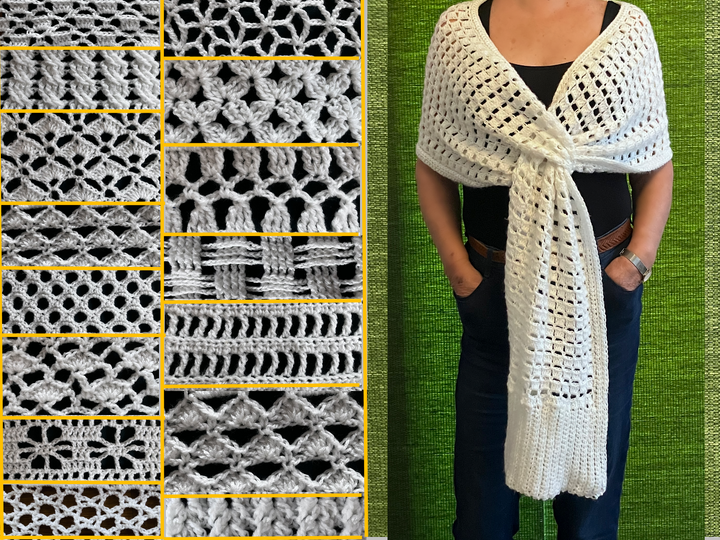 Mit dieser Anleitung habe ich etwas Besonderes realisiert. Es ist einerseits die Anleitung für einen hübschen Schal / eine Stola und andererseits ein Häkel-Musterbuch meiner Lieblingsmuster. Denn ich beschreibe auf 20 Seiten 20 verschiedene – besonders schöne – unterschiedlich schwere Muster. Du wählst eines dieser 20 Muster aus und häkelst daraus diesen Schal. Natürlich kannst du auf den 160 cm Länge auch verschiedene Muster einsetzen. Wie der Schal gehäkelt wird, zeige ich Schritt für Schritt. Die Arm-Stulpen brauch man nicht unbedingt, wärmen aber schön. Der Schal ist mit den einfachen Mustern auch für Anfänger realisierbar.