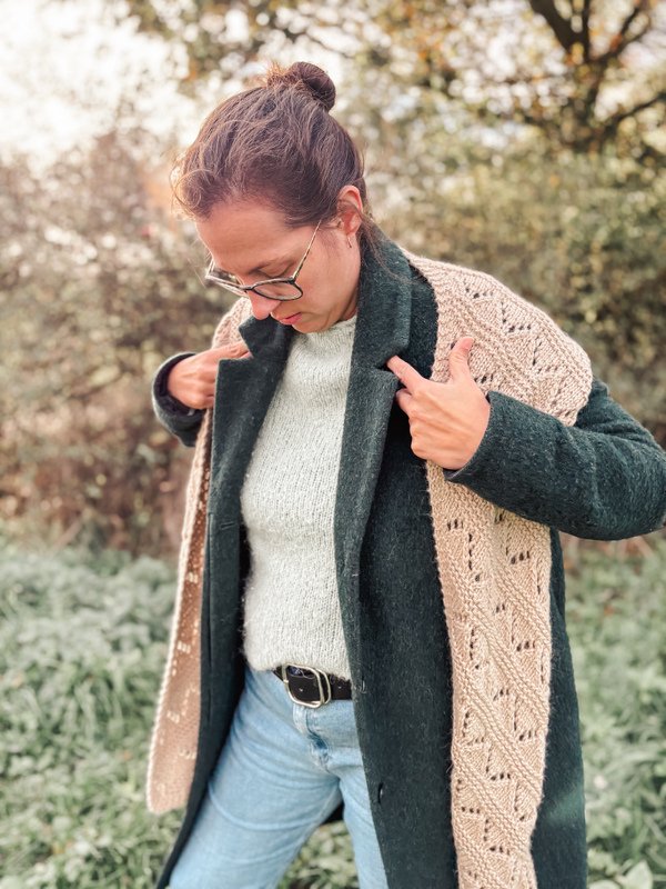 Maras MountainScarf ist ein voluminöser, weich fallender Schal mit einem plastischen Strukturmuster aus Rippen und feinen Lochreihen. Das rhythmische Muster erinnert an Berglandschaften und verleiht dem Design Tiefe und Bewegung. Trotz seines detailreichen Erscheinungsbilds ist der Schal angenehm entspannend zu stricken. Ein Projekt zum Wohlfühlen und Einkuscheln.