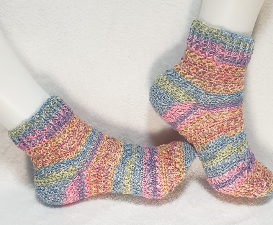 Mit dieser Häkelanleitung können diese Socken in allen Größen - von Neugeborenem bis Größe 48 - nachgearbeitet werden