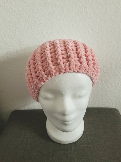 Aus Chenille Garn gehäkelt ist es sehr leicht und trotzdem warm. Du kannst es in verschiedenen Größen häkeln. Angaben dazu findest du im Text.