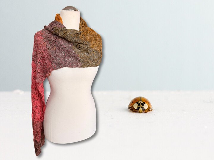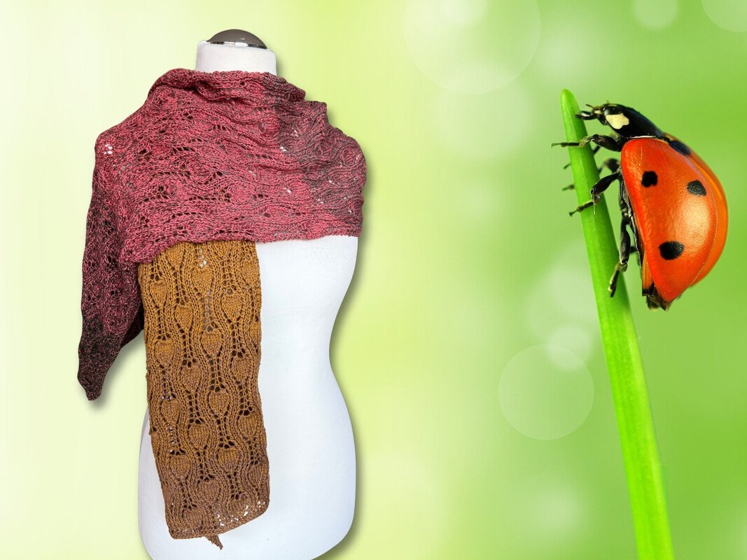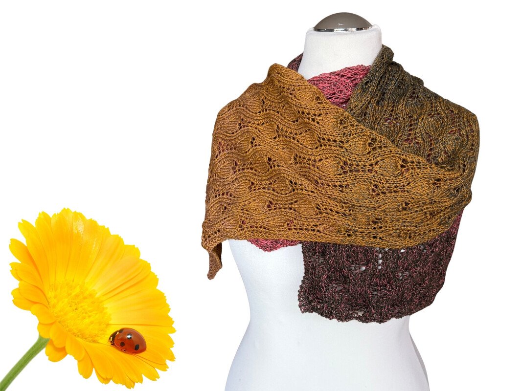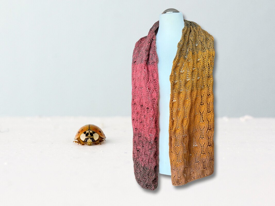 Rogart ist ein leichter, elegant strukturierter Schal, der durch sein ausdrucksvolles Lochmuster und den fließenden Farbwechsel sofort ins Auge fällt. Das Muster erzeugt einen harmonischen Rhythmus aus Wellen und kleinen Öffnungen, wodurch der Schal sowohl luftig als auch formstabil wirkt.