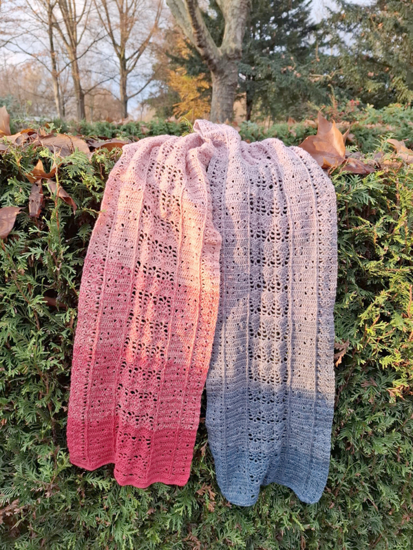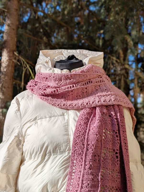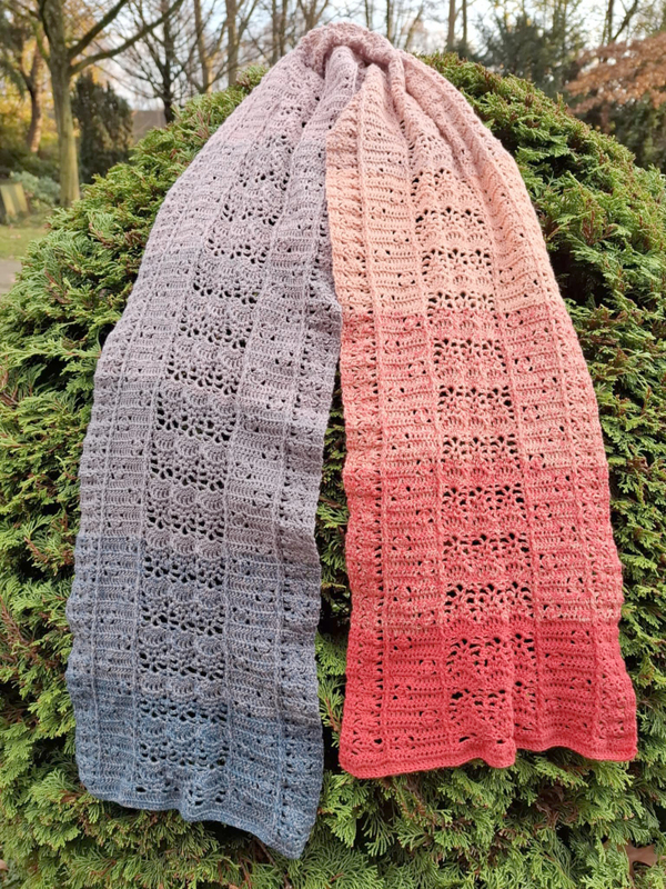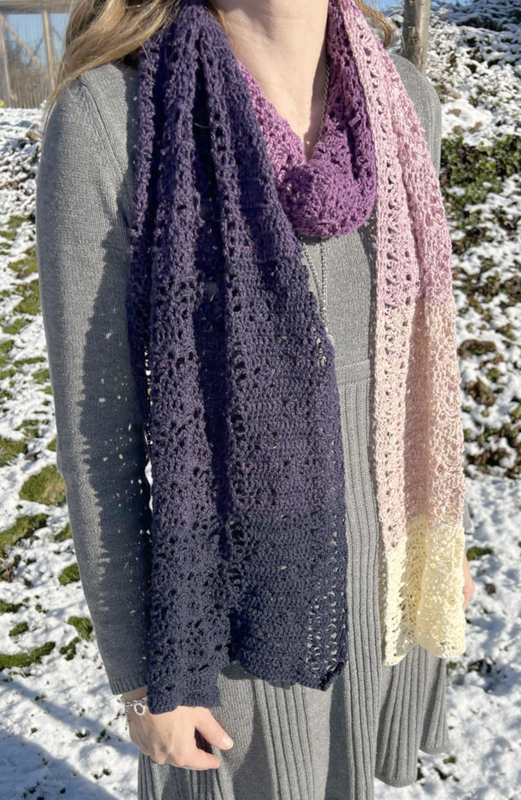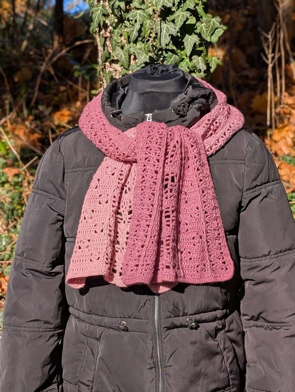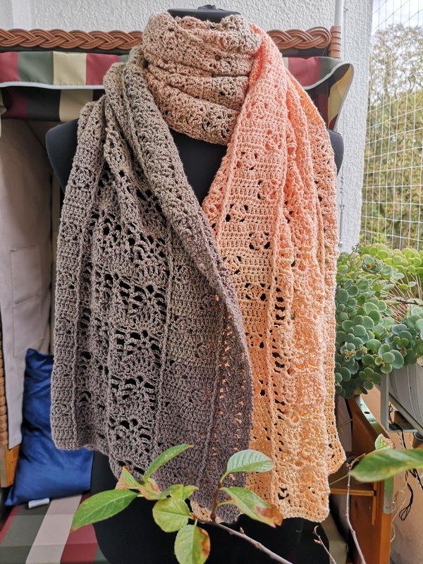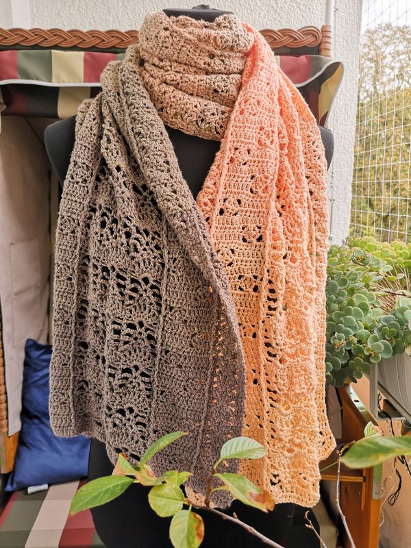Trotz des luftigen Musters fühlt er sich warm und kuschelig an. Mit anderem Garn kannst du ihn als luftiges Sommeraccessoire arbeiten.