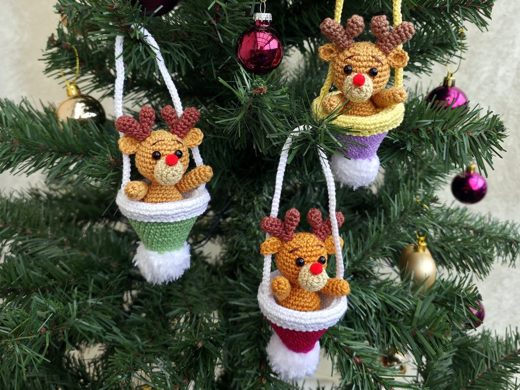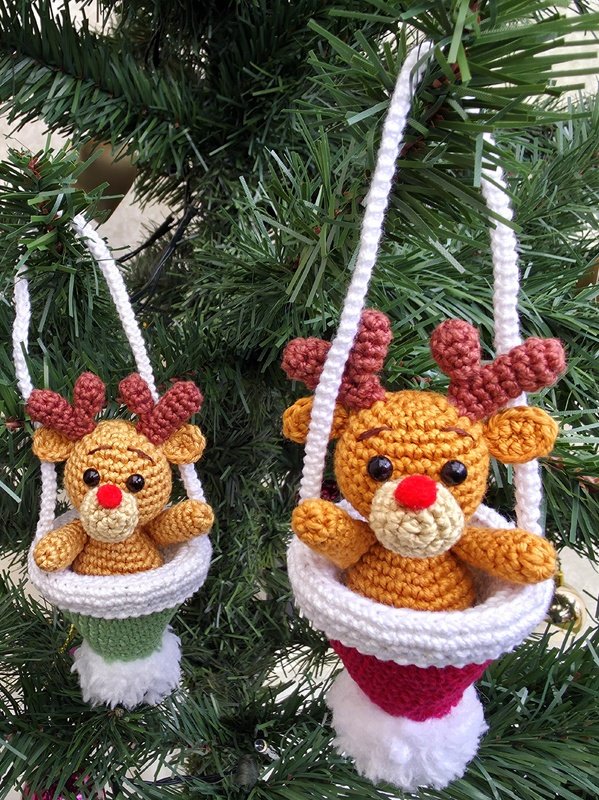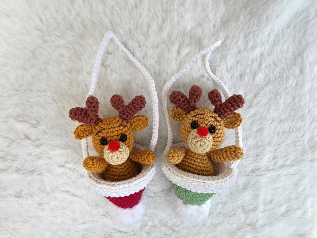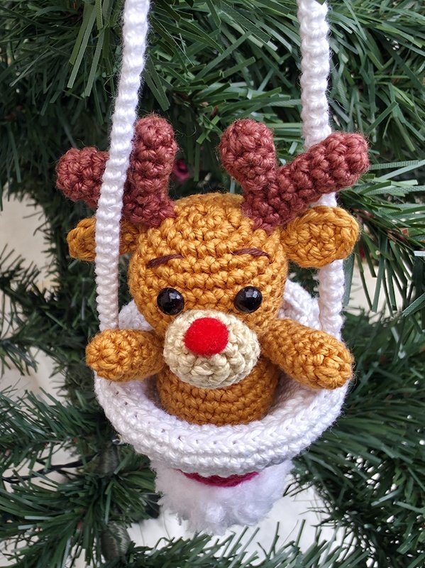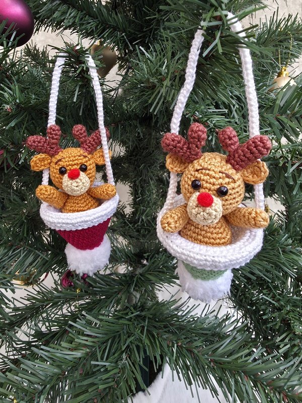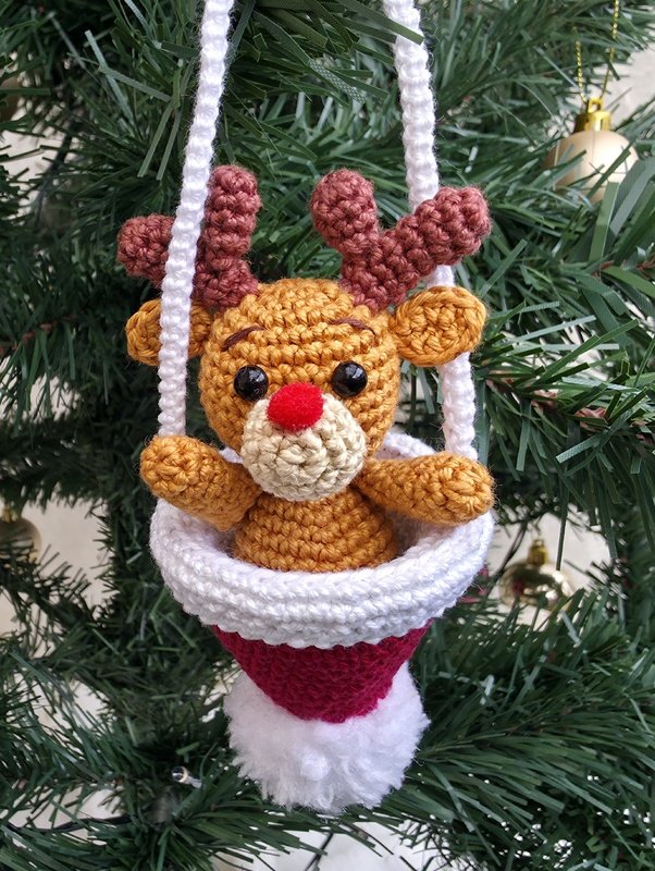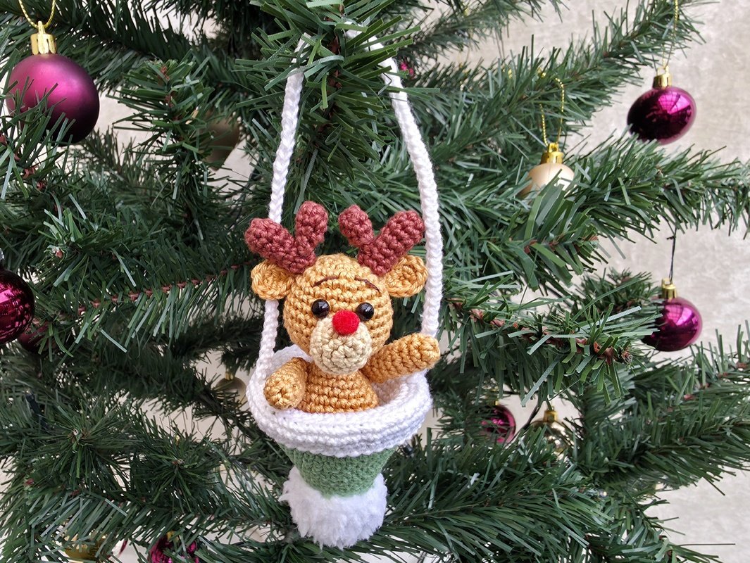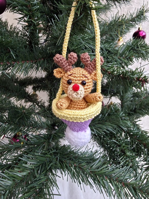 Der Elch ist direkt in die Bommelmütze eingehäkelt und sitzt dadurch fest in der Aufhängung - Füße hat er keine.