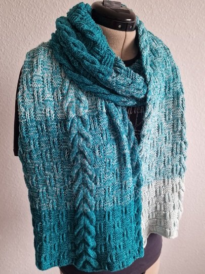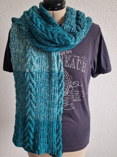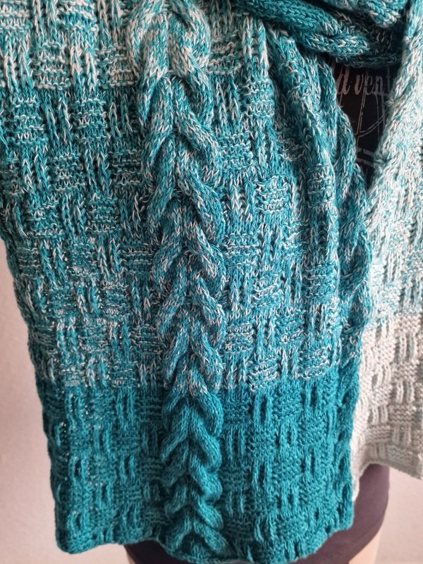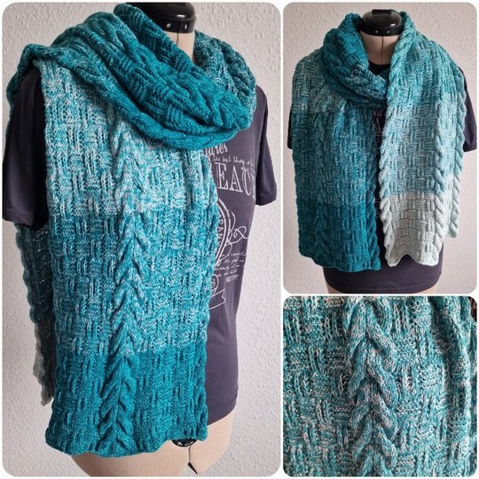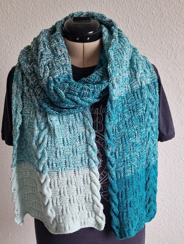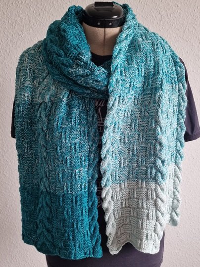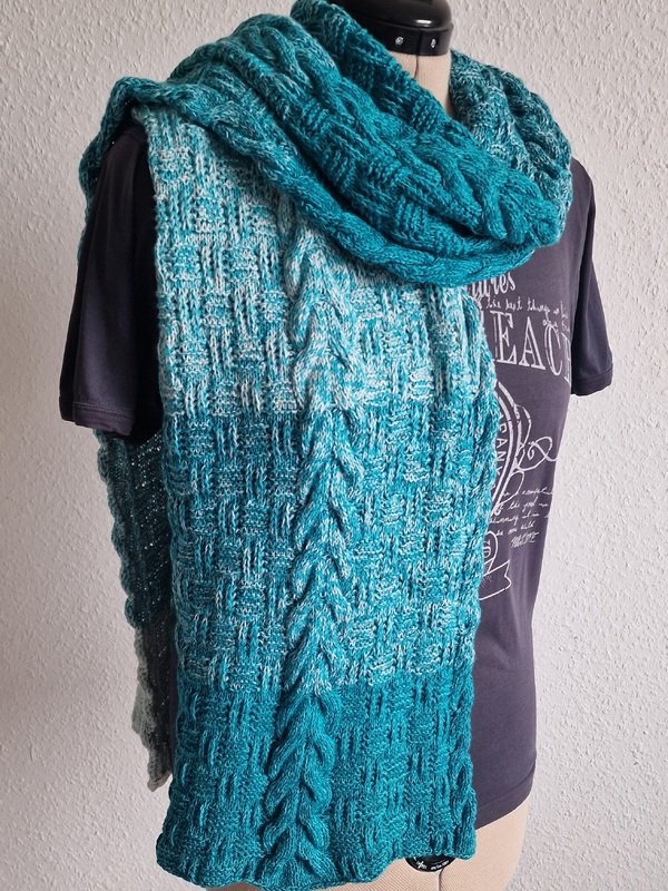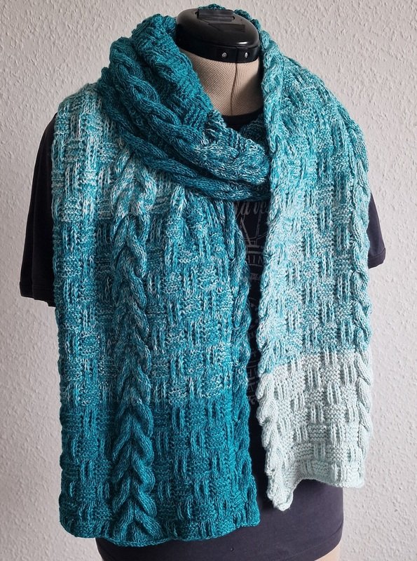 Er ist auf Kundenwunsch als gestricktes Gegenstück zu dem gehäkelten Schal "Sascha" entstanden.