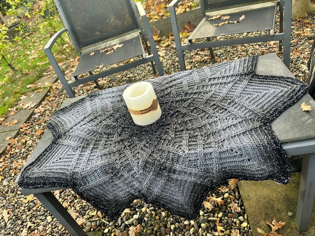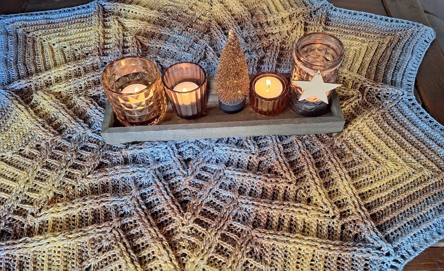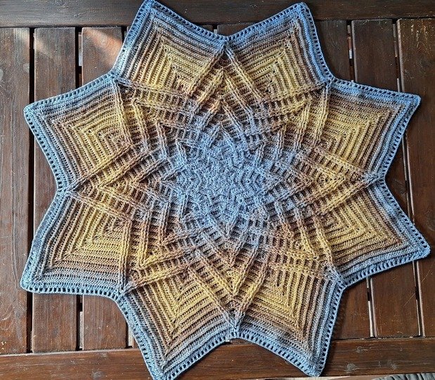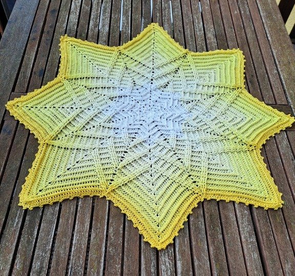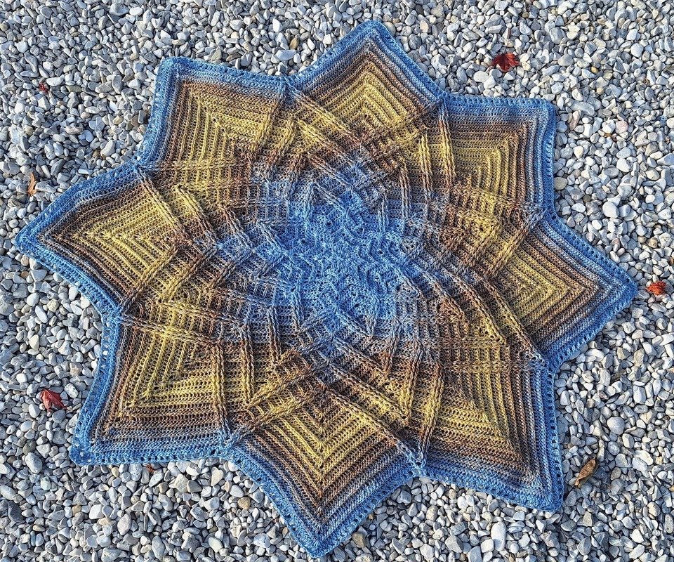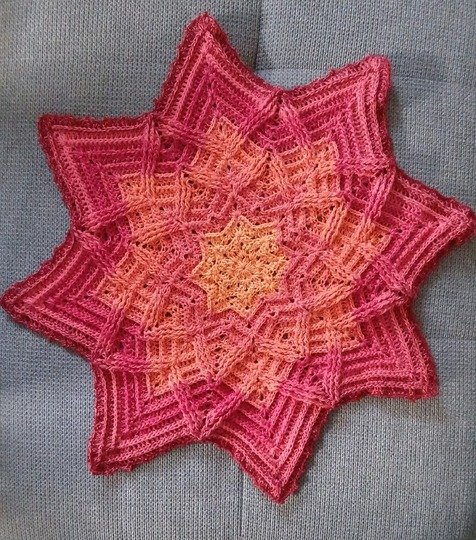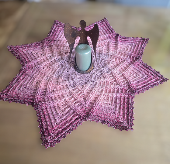 Durch die besondere Anordnung der Maschen entstehen acht klare Zacken und im Inneren eine reliefartige Maserung, die an ein Kaleidoskop erinnert und dem Deckchen seinen charakteristischen Look verleiht.