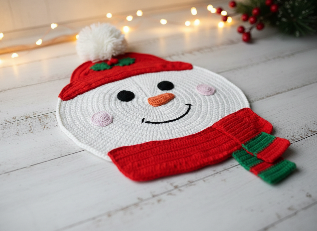 Dies ist eine Häkelanleitung für ein Set mit Schneemann-Motiv für den Weihnachtstisch.