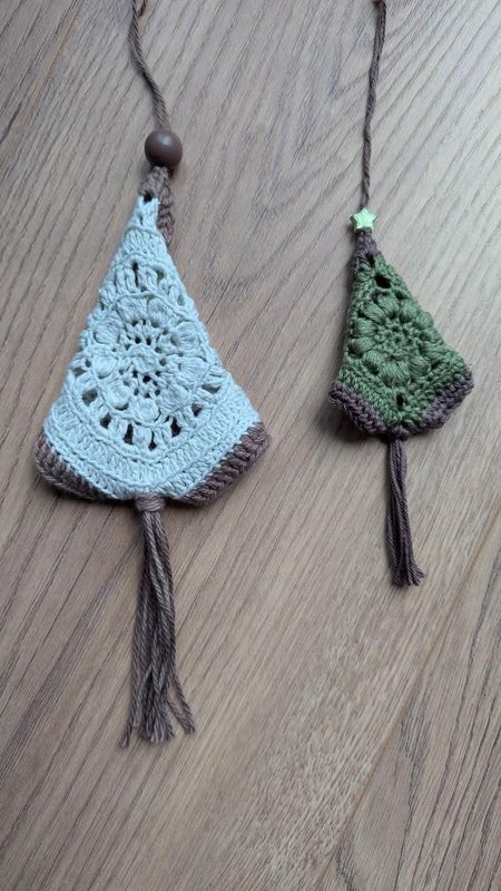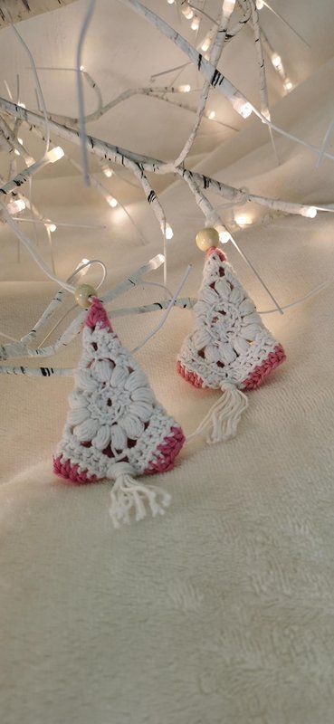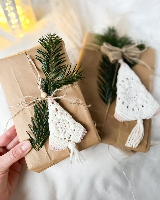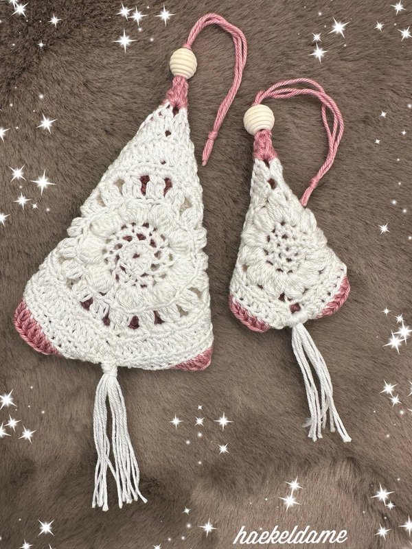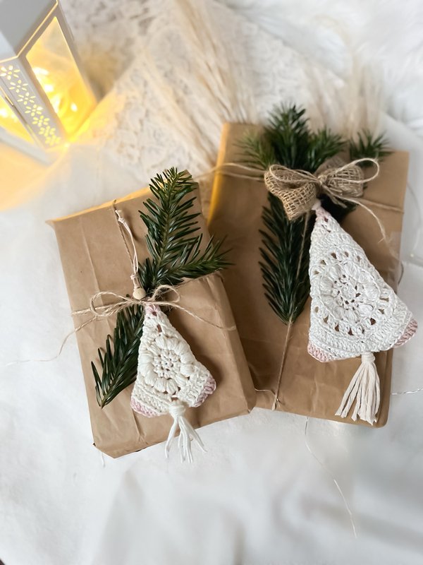 Du erhältst eine liebevoll gestaltete Häkelanleitung, mit der du diese süßen Tannenbäumchen im Boho-Look häkeln kannst.