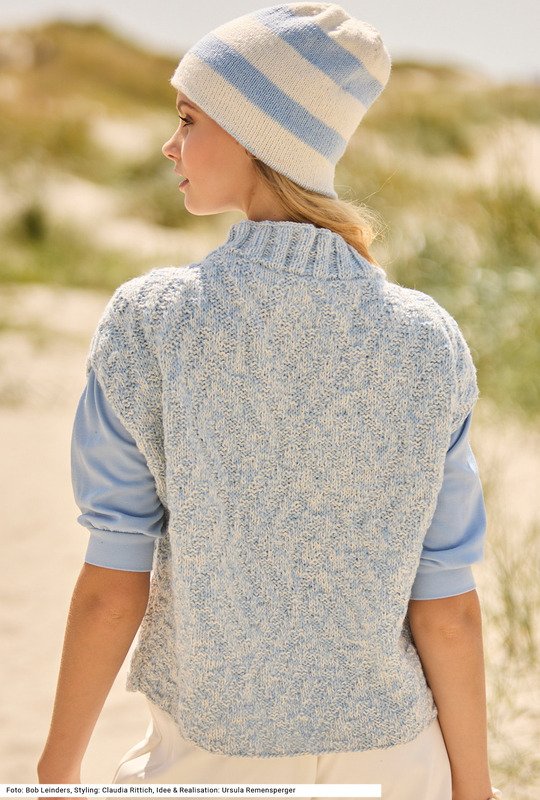 Bei diesem Duo wird dasselbe Garn (aus Schurwolle, Polyamid und Kaschmir) verwendet, bei den Farben und Mustern unterscheiden sich jedoch Pullunder und Mütze. Der Pullunder hat ein Reliefmuster aus rechten und linken Maschen, die Mütze wird glatt rechts gestrickt. Der zarte Melange-Effekt entsteht durch die zweifädige Kombination aus heller und dunklerer Farbe. Die Mütze besticht durch klare Streifen aus diesen zwei Farben. Sie ist doppellagig glatt rechts gearbeitet – außen gestreift, innen uni. Eine Anleitung gibts für die Größen 38 – 42 und 44 – 48; Mütze: 52 – 54 und 55 – 57 cm Kopfumfang.