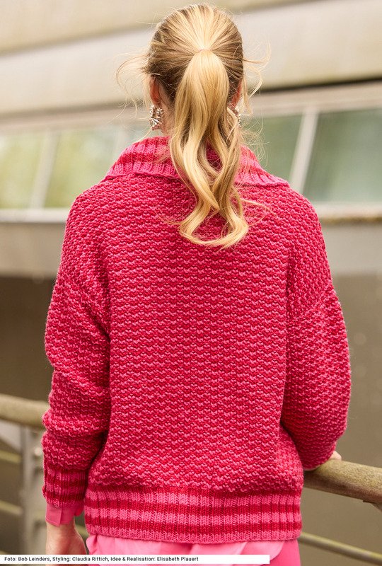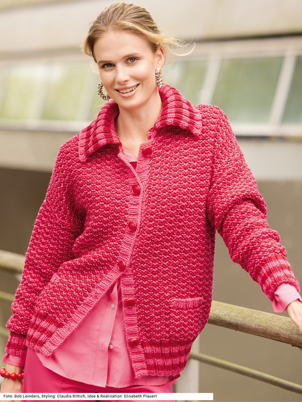 Diese sportive Bicolor-Jacke fasziniert mit vielen Details. Da ist zum einen das einfach zu strickende Rechts-links-Muster, zum anderen die gestreift gestrickten Rippenbündchen und der ebenfalls gestreifte opulente Kragen und nicht zuletzt die Eingrifftaschen, die Platz für ein Taschentuch oder den Schlüssel bieten. Einzig die Taschenblenden und die Knopfleiste sind unifarben. Die Ärmel werden gerade eingesetzt, was überfallende Schultern ergibt. Das Garn aus reiner Schurwolle läuft angenehm schnell über die Nadeln. Eine Anleitung gibts für die Größen 38/40, 42/44 und 46/48.