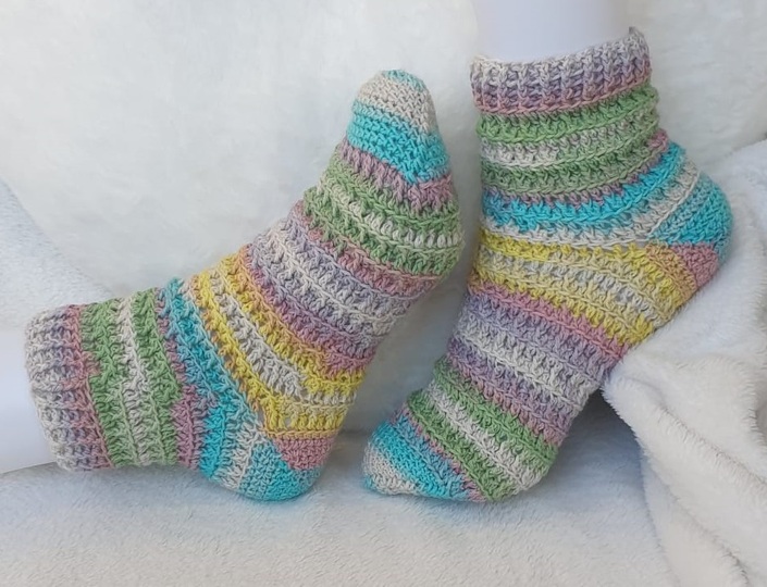 Diese Socken können sowohl mit leichtem Baumwollgarn für z.B. sommerliche Söckchen oder mit dickem Garn für eine flauschige Fußbekleidung gehäkelt werden.