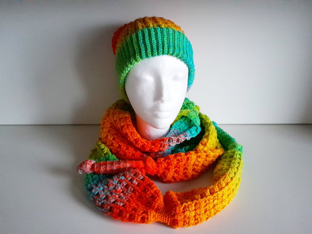 Schritt für Schritt zeige ich dir, wie du diesen extravaganten Schal häkelst. Beim Beanie erkläre ich dir einen Trick, wie du ihn dauerhaft in Falten legen kannst und beim Anziehen keinen Spiegel benötigst um beaniegestylt aus dem Haus zu gehen. Die modischen Handstulpen sind die perfekte Ergänzung zu diesem Komplettset.