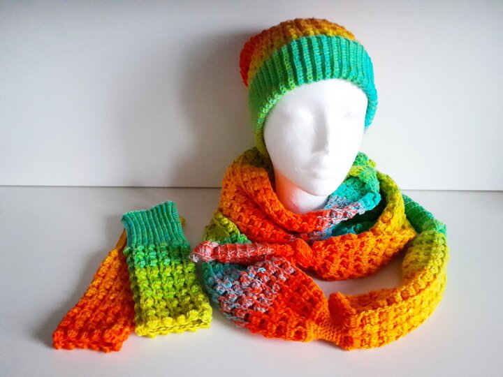 In meinem Shop findest du auch die Anleitungen für die passenden Beanie und Handstulpen oder alternativ Schal, Beanie und Handstulpen als Komplettset.