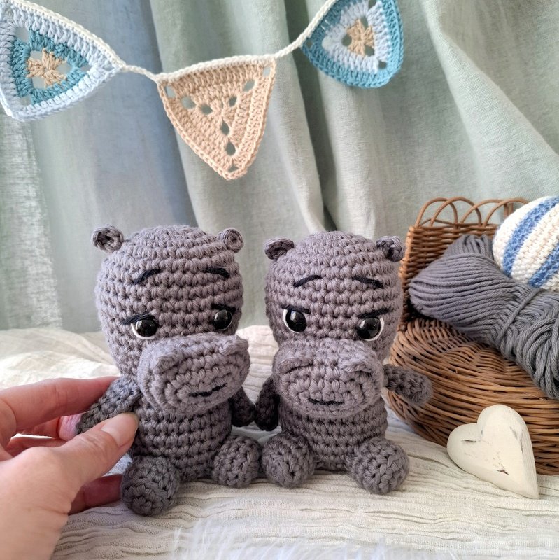 Das herzige kleine Nilpferd, eignet sich perfekt als Mobiletierchen oder als Anhänger für eine Schnuller- oder Kinderwagenkette. Mit dickerem Garn passt es auch wunderbar als Rassel