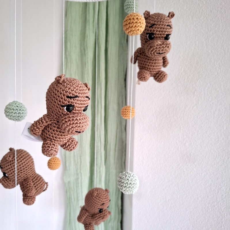 Ein gehäkeltes Mobile mit Nilpferden und Kugeln, ist das perfekte Geburtsgeschenk um die Einrichtung im Babyzimmer abzurunden. Häkle jetzt das hübsche Nilpferdmobile und punkte mit der tollen Geschenkidee!