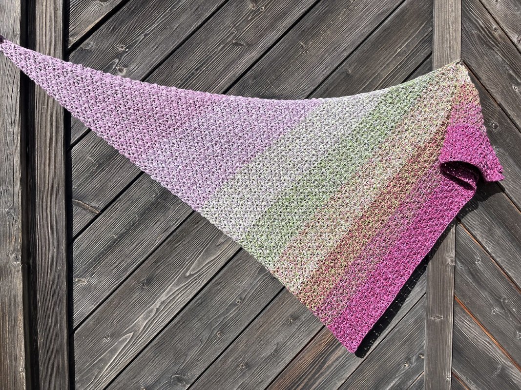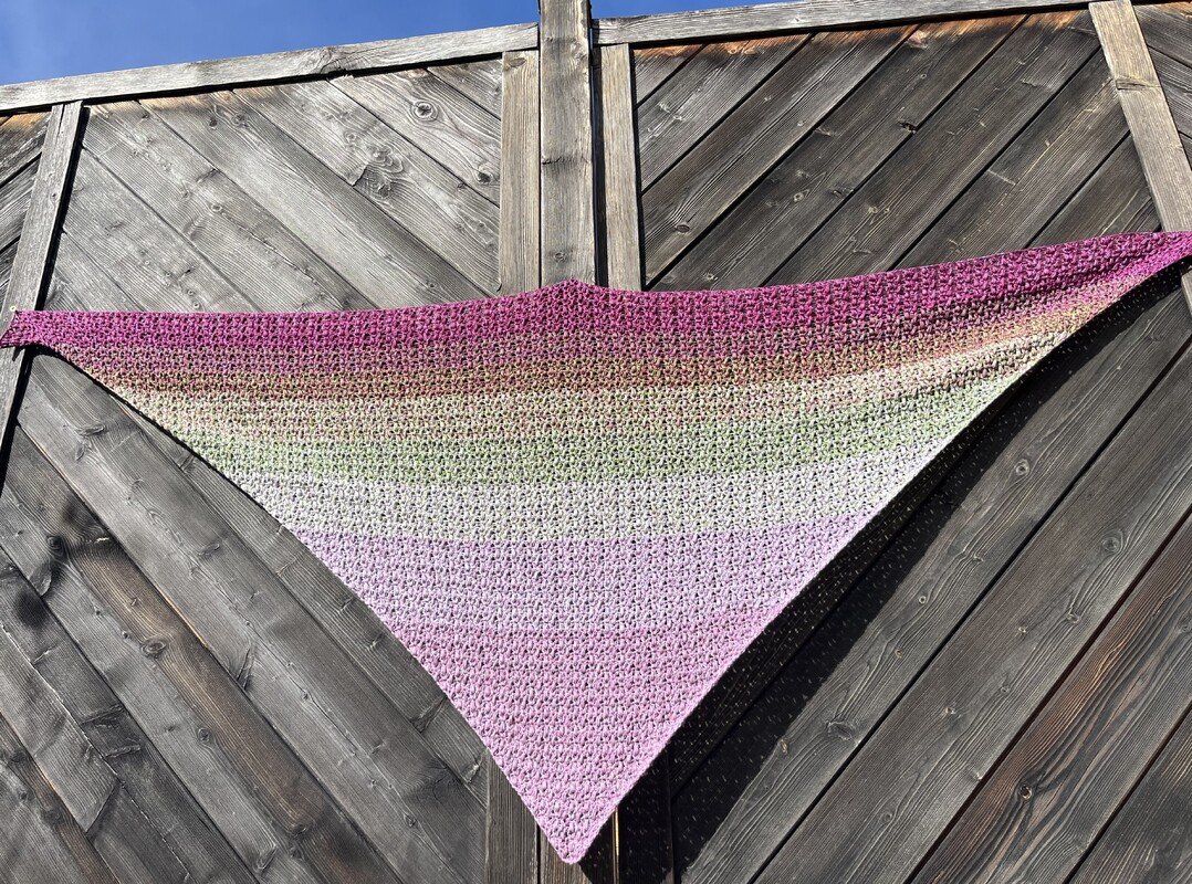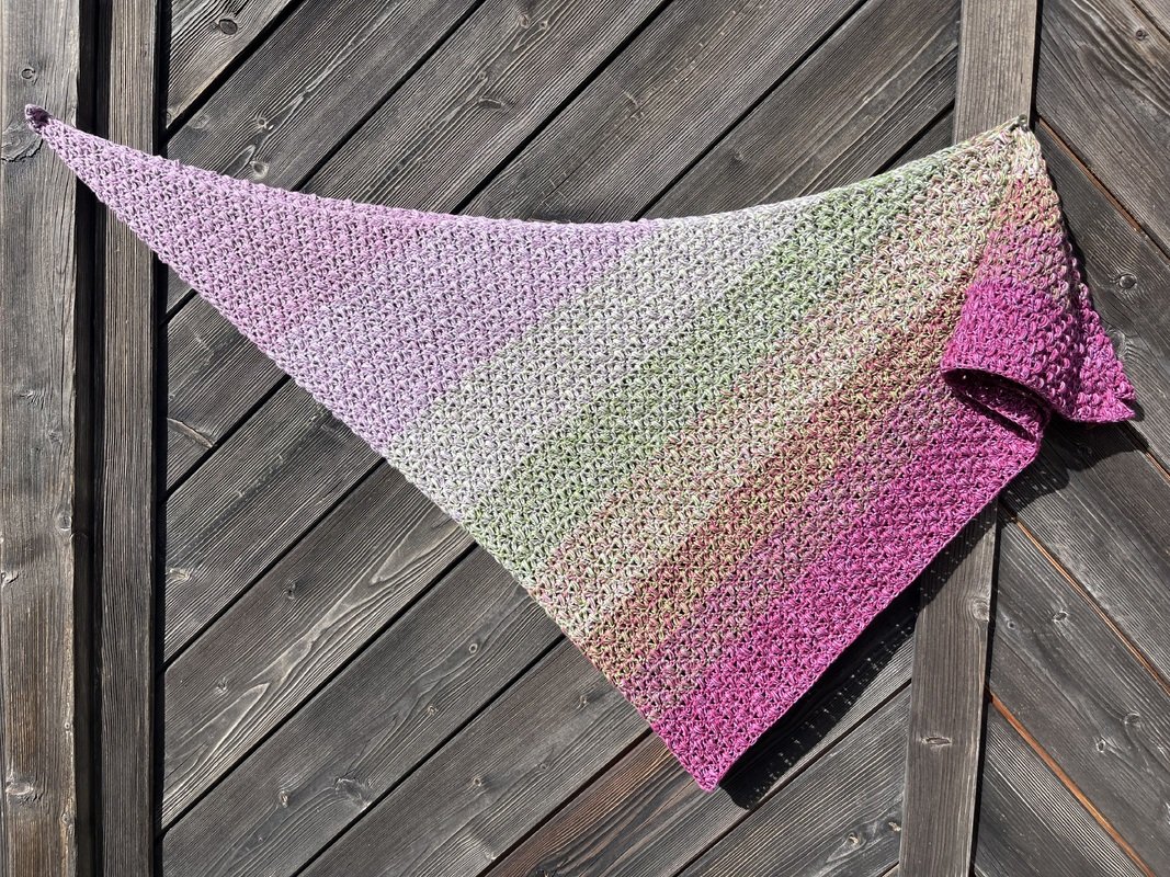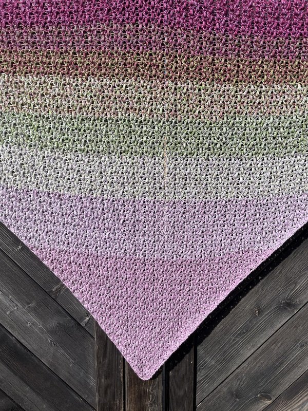 Das Tuch hat ein Endlosmuster, das man schnell im Kopf behält und kann in beliebiger Größe gehäkelt werden.