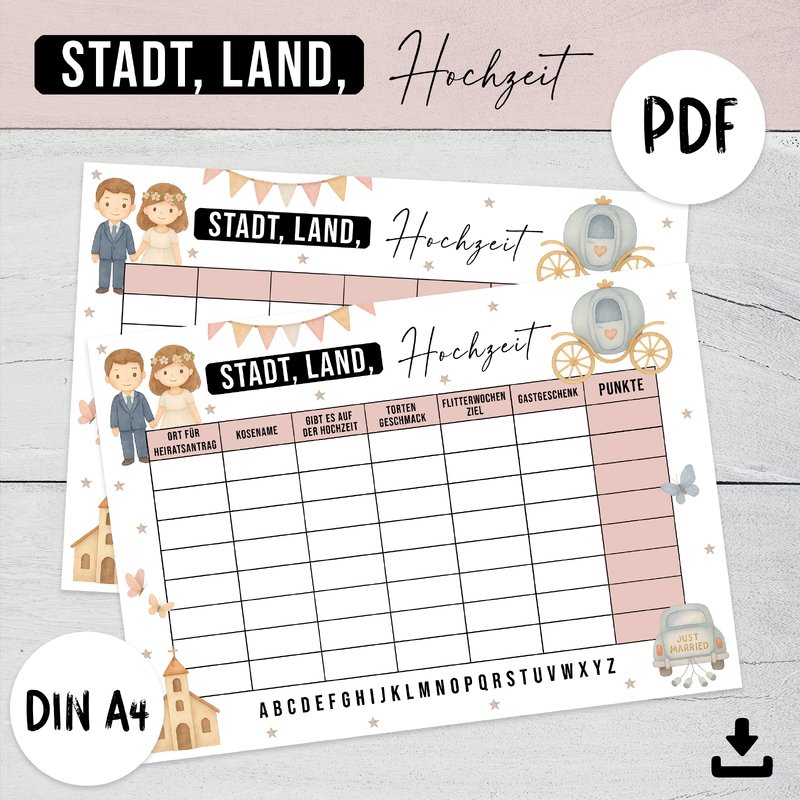Damit ihr das Spiel "Stadt, Land, Hochzeit" auf eurer Hochzeit spielen könnt, benötigt jeder Spieler eine entsprechende Vorlage.