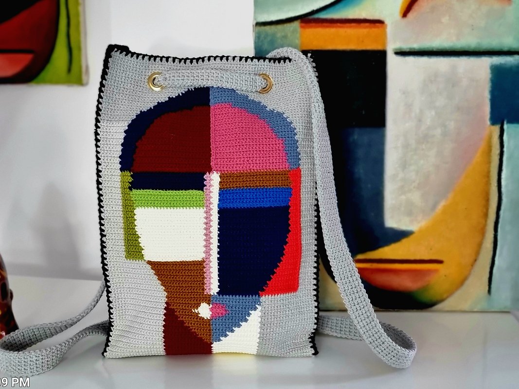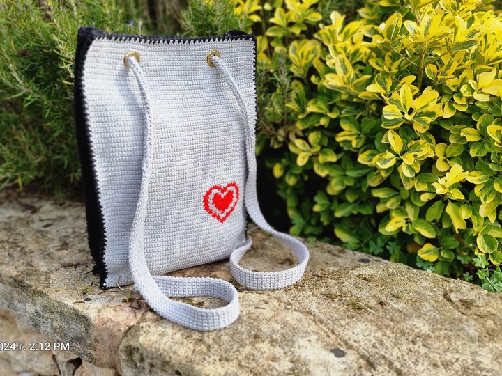 Die fertigen Maße können je nach Garn und Häkelnadelstärke variieren. Die Maschenprobe beeinflusst ebenfalls die Größe der fertigen Tasche. Dieses Modell hat eine feste Maschenprobe.