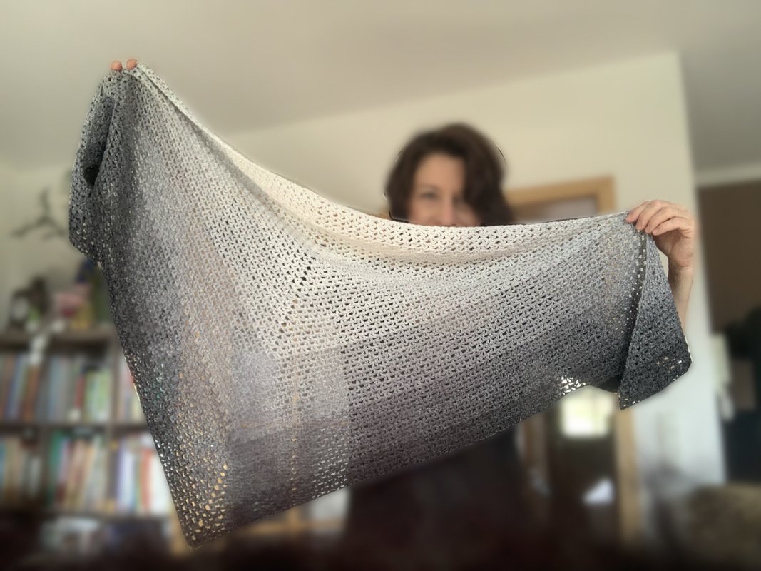 Dieses Tuch lässt sich auch von Anfängern einfach und gemütlich nacharbeiten: Du benötigst nur Luftmaschen und Stäbchen und kannst entspannt dabei zusehen, wie Dein Tuch immer weiter wächst!