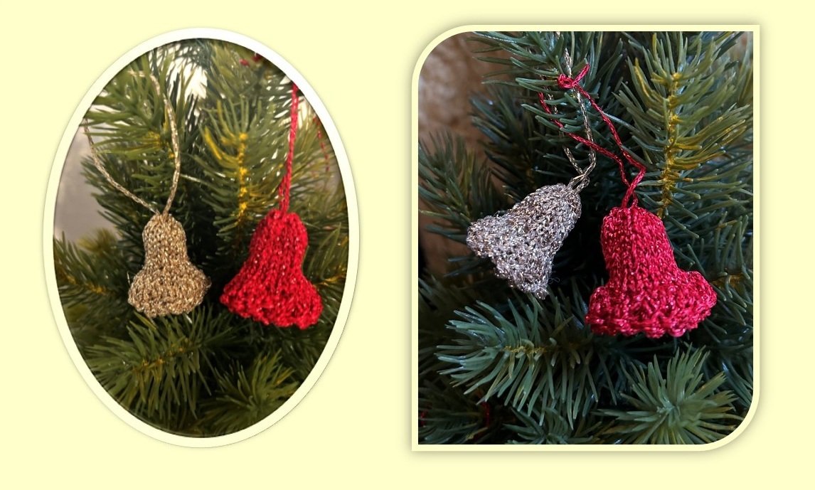 Mit dem hier verwendeten Metallic-Garn, gestrickt mit Nadelstärke 2,5, passt das Glöckchen wie ein Fingerhut über einen Daumen – so klein ist es.