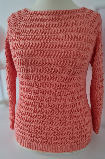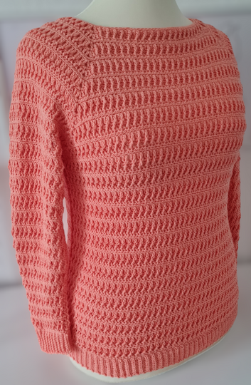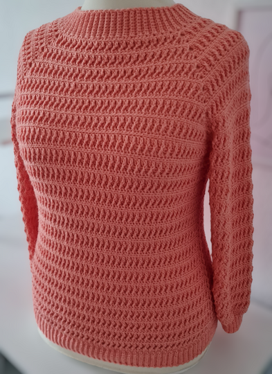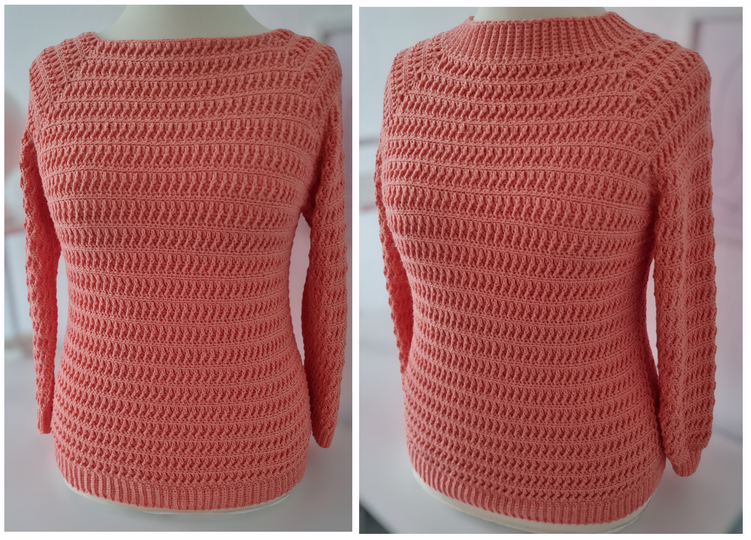 Der Pullover wird mit der RVO-Technik gearbeitet und kann somit individuell an jede Konfektionsgröße angepasst werden.