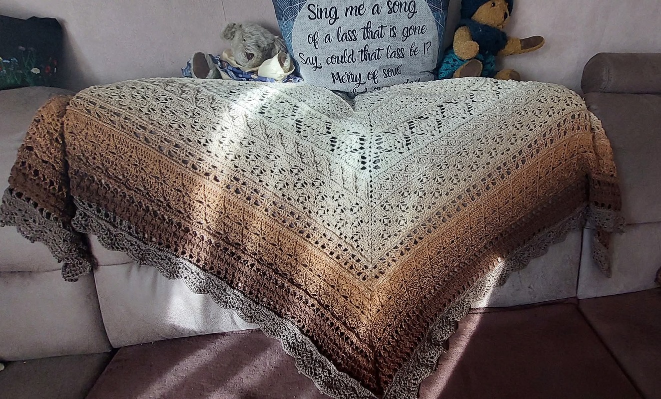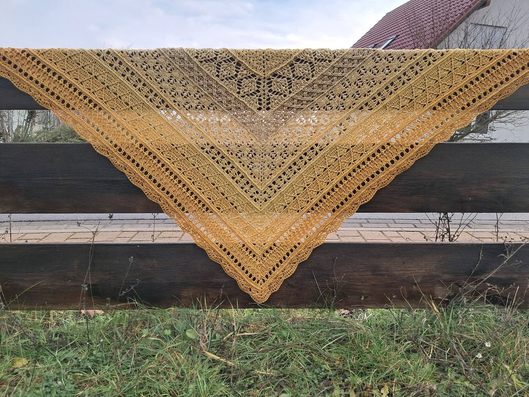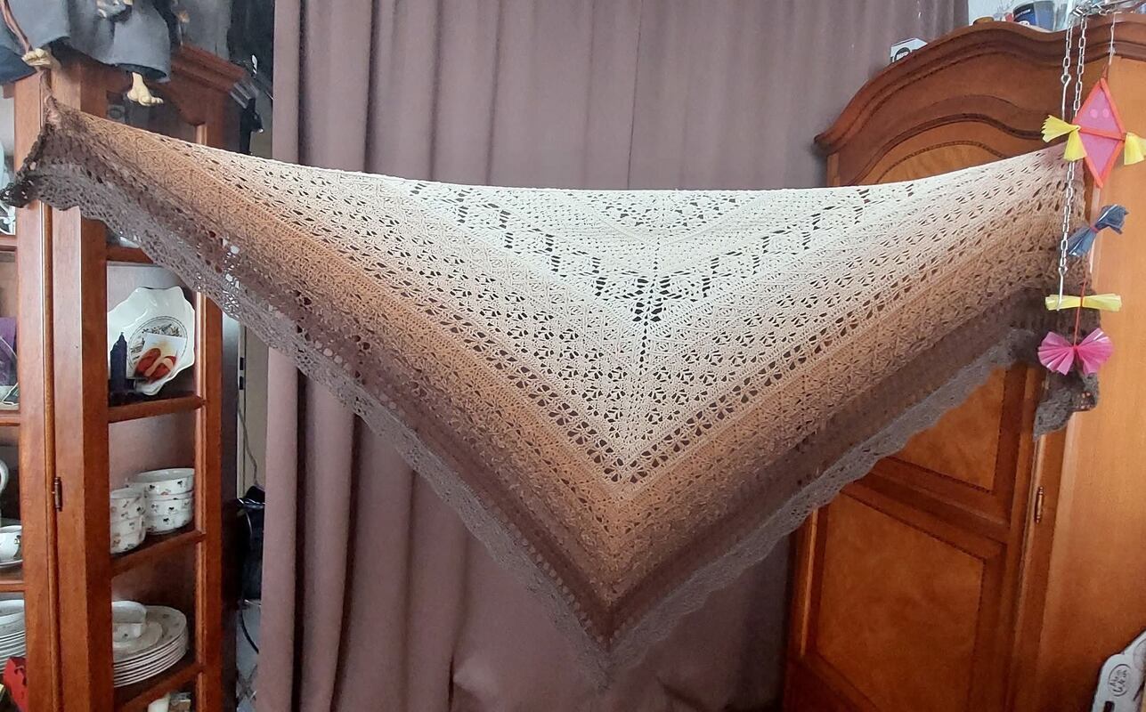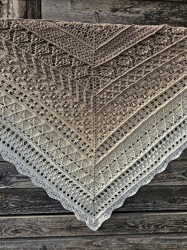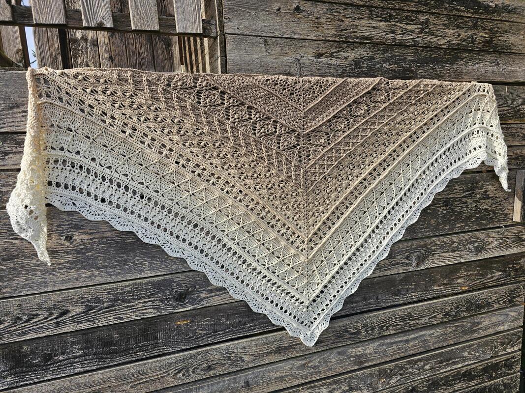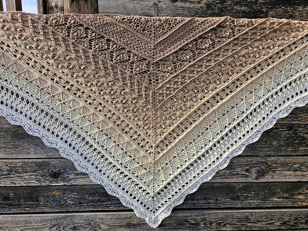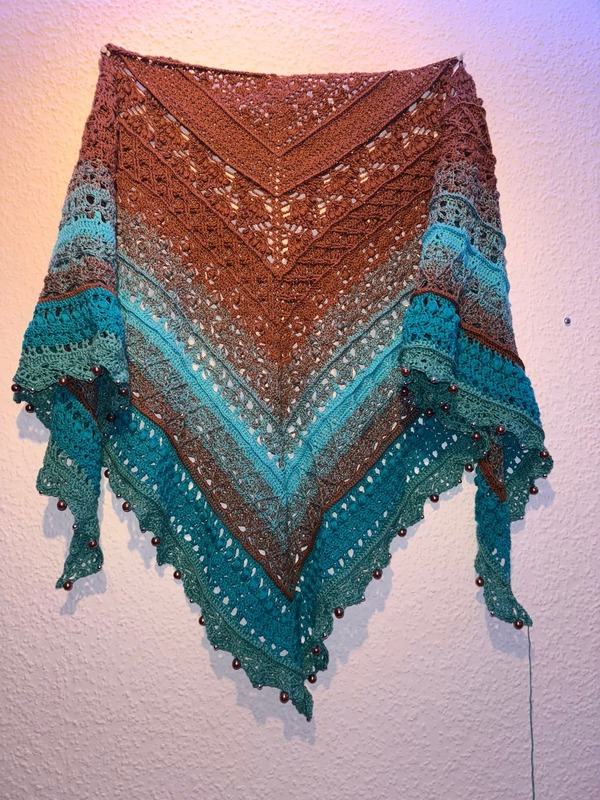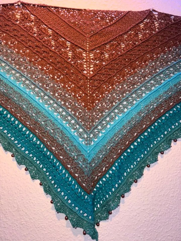 Es kann mit jedem gewünschten Garn gehäkelt werden, ich würde dazu einen Farbverlaufsbobbel mit einer Lauflänge von mindestens 1500 m 3-fädig oder 1700 m 4-fädig empfehlen. Ich habe für mein Tuch den Bobbel Milchkaffee von Agi´s Fadenspielerei verwendet.