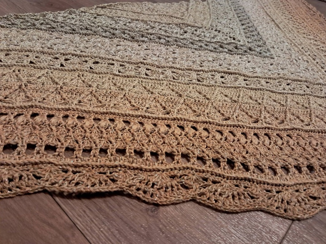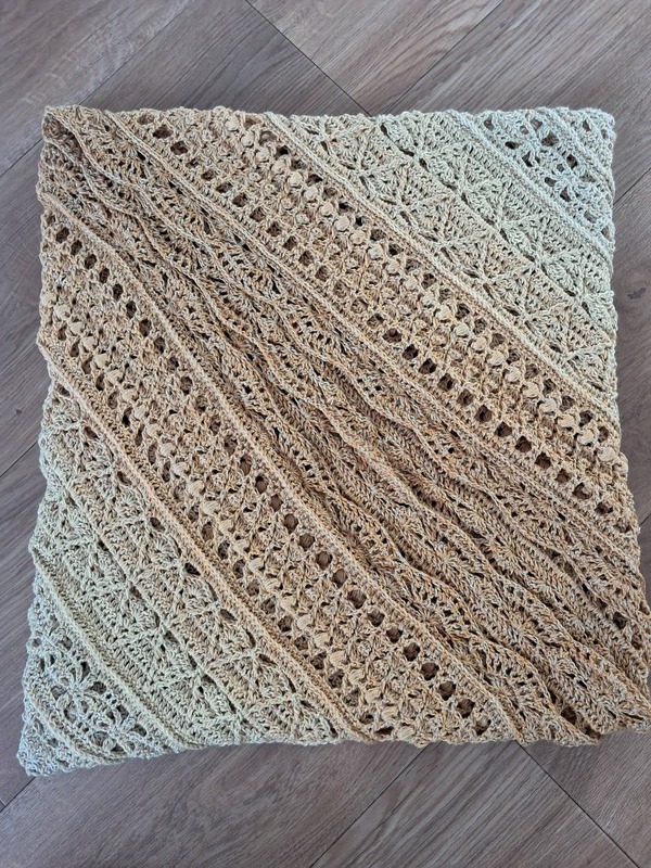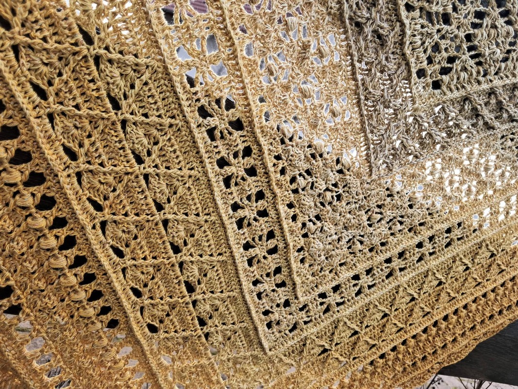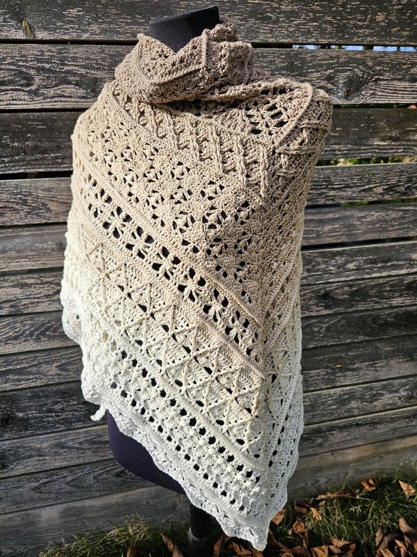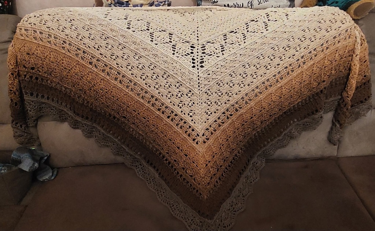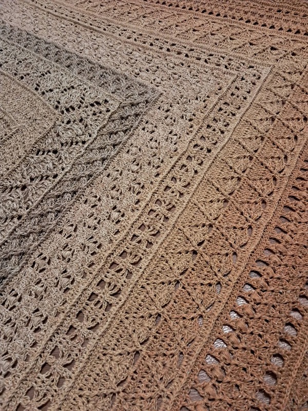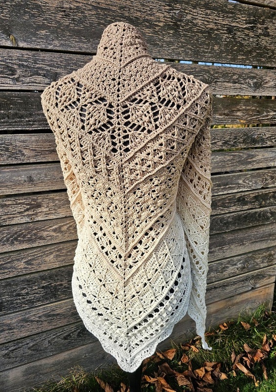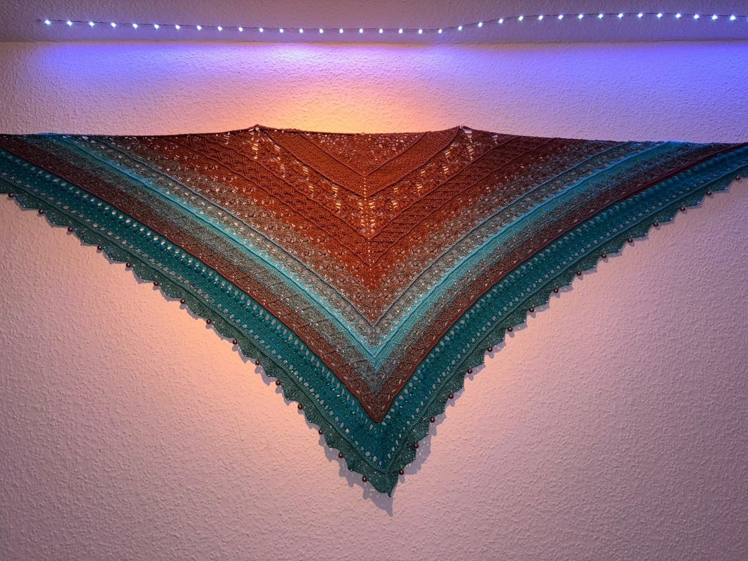 Es kann mit jedem gewünschten Garn gehäkelt werden, ich würde dazu einen Farbverlaufsbobbel mit einer Lauflänge von mindestens 1500 m 3-fädig oder 1700 m 4-fädig empfehlen. Ich habe für mein Tuch den Bobbel Milchkaffee von Agi´s Fadenspielerei verwendet.