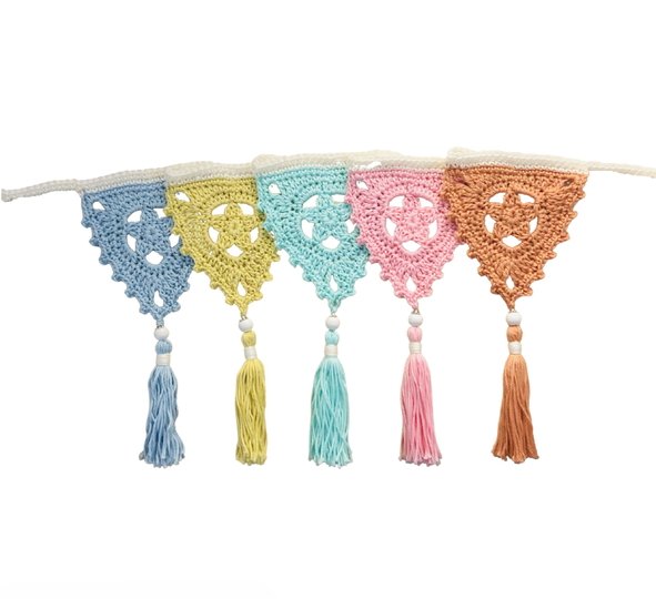 Nach dieser Häkelanleitung lassen sich Wimpelgirlanden mit drei verschiedenen Motiven - Stern, Herz, Blume - häkeln. Die dekorative Quaste verleiht ihnen den angesagten Boho-Look. Ob man dabei bunt oder einfarbig arbeitet, spielt keine Rolle. Sie sehen einfarbig ebenso toll aus wie kunterbunt.