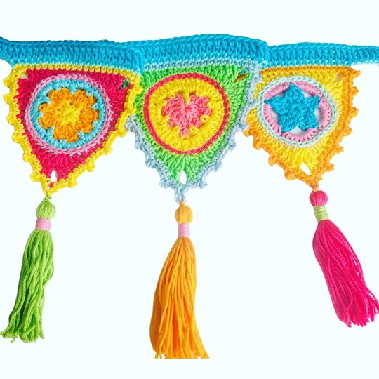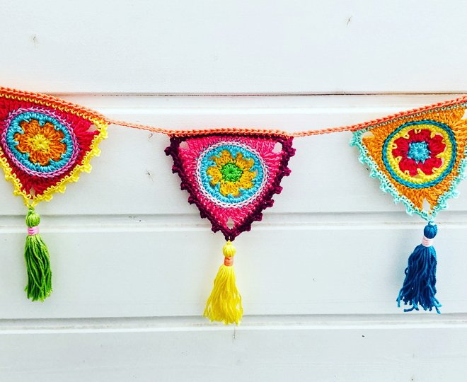 Diese Häkelanleitung erklärt Schritt für Schritt mit Text und vielen Detailbildern das Herstellen von Wimpeln bzw. einer Wimpelgirlande im kunterbunten Boho-Stil mit Boho-typischer Quaste - für die Wimpel stehen drei verschiedene Motive zur Auswahl, die nach Belieben miteinander kombiniert werden können.