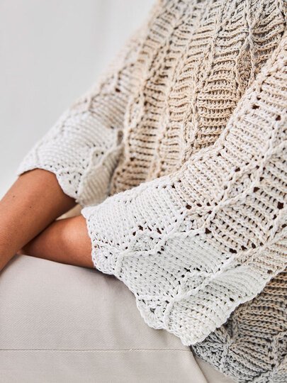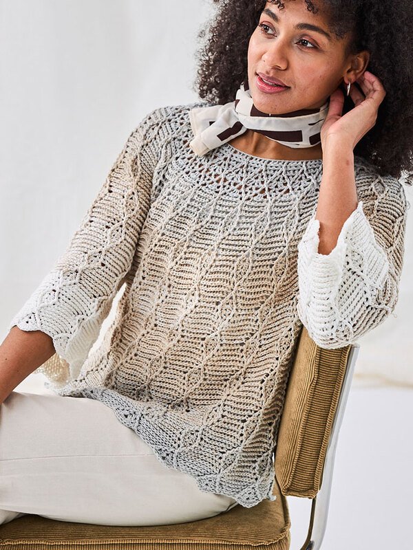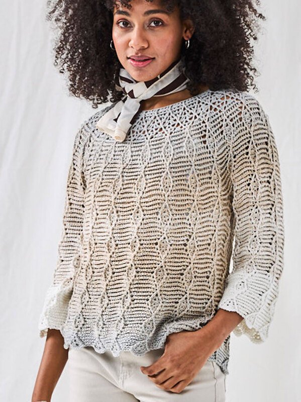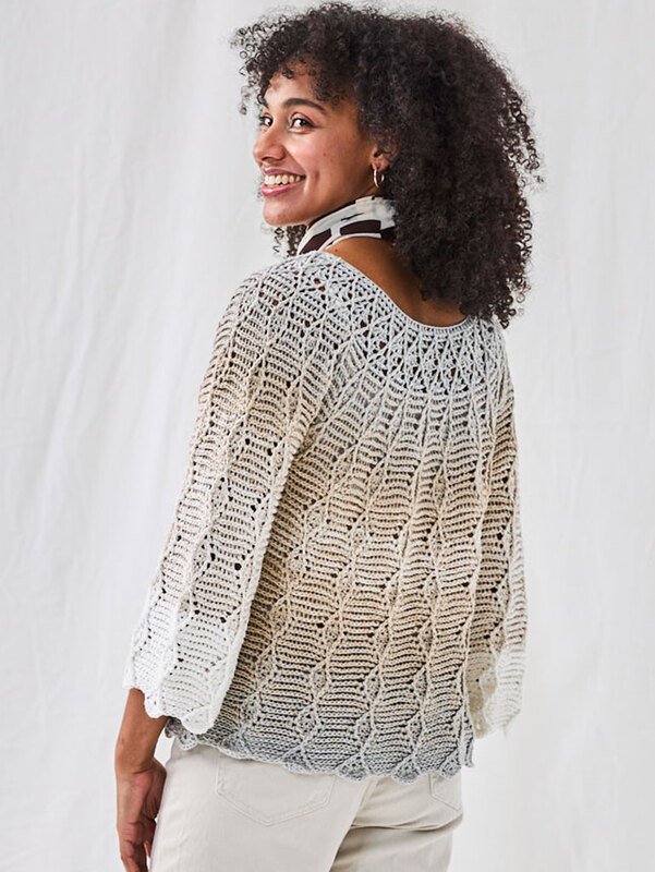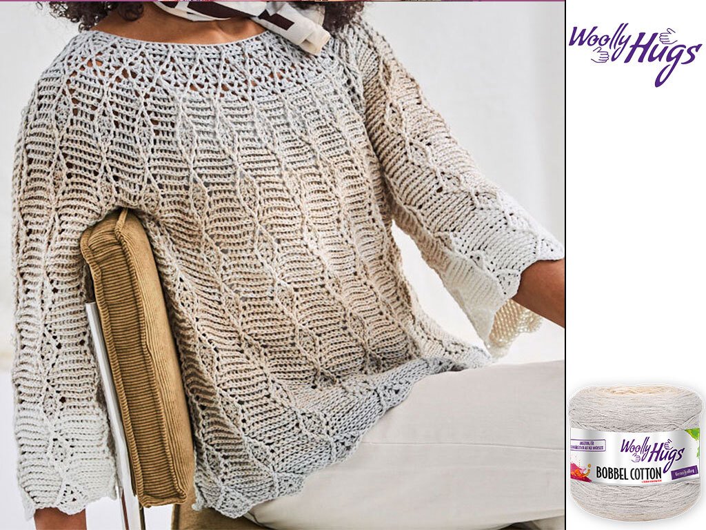 Ich hab diesen Pullover aus den Woolly Hugs Bobbel Cotton gehäkelt und bin hin und weg: zarter Farbverlauf, luftig-leichtes Muster und diese tollen Ärmel. Er fühlt sich himmlisch an, perfekt für Sommerabende oder als einfach darüber ziehen.