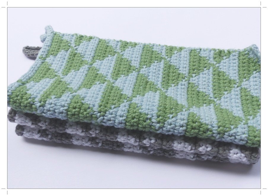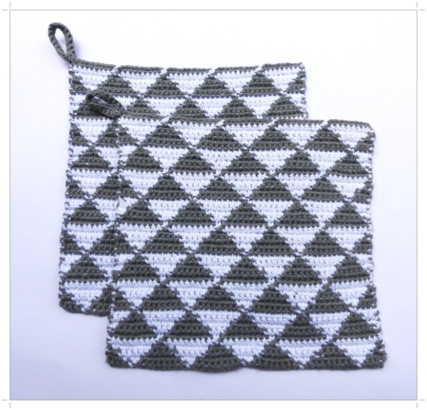 Eine Häkelanleitung für Topflappen die zweifarbig gehäkelt werden ohne Spannfäden. Der Übergang des Farbverlaufes ist ausführlich beschrieben und ist deshalb gut nachzuhäkeln.