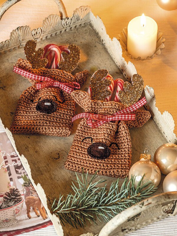 Meine kleinen Rentier-Säckchen sind in einer Stunde gehäkelt und einfach nur zuckersüß! Ein paar feste Maschen, ein bisschen Braun fürs Gesicht, Glitzergeweih drauf, Schleifchen drum – fertig. Perfekt für Zuckerstangen, kleine Geschenke oder als süßer Adventskalender.