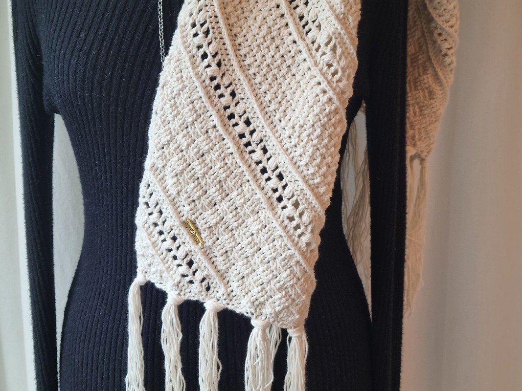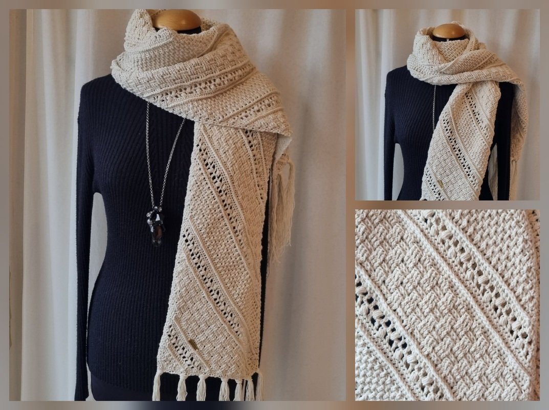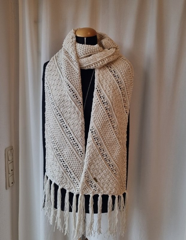 5x Baumwollgarn 8/4 170m/50g Farbe beige mit Nadelstärke 3,5. Der Schal wurde LxB = 150x21cm.