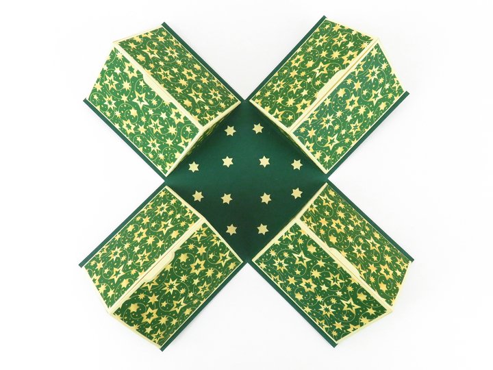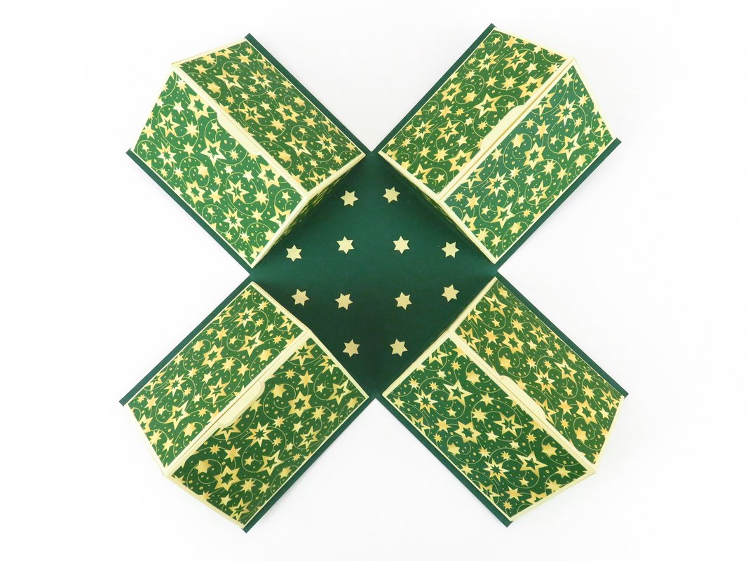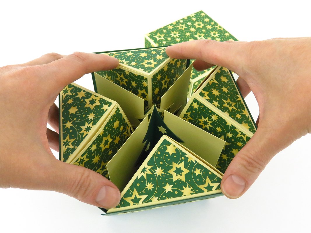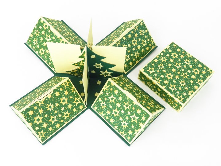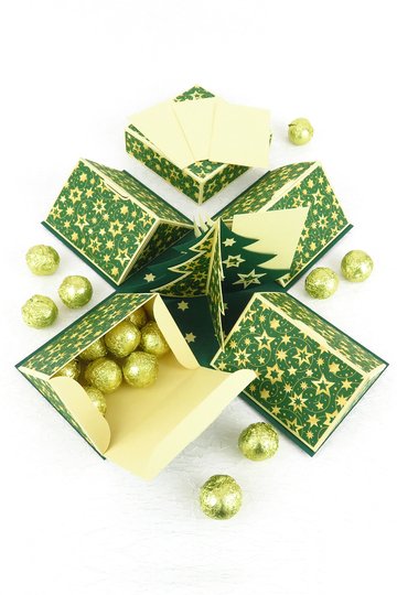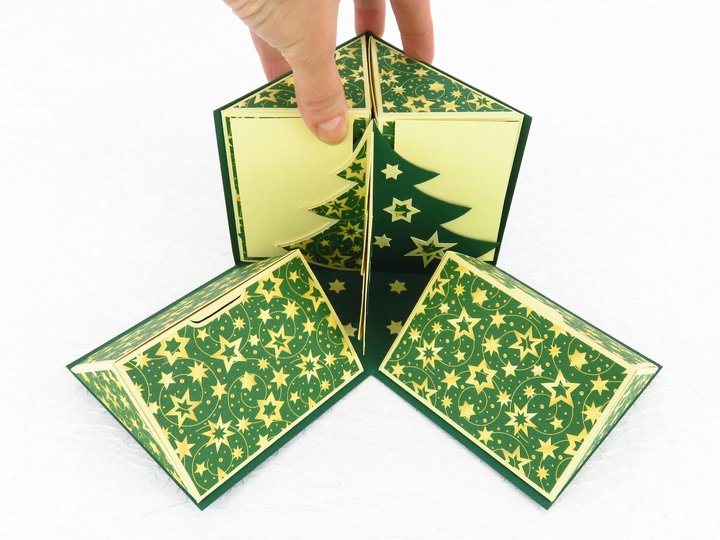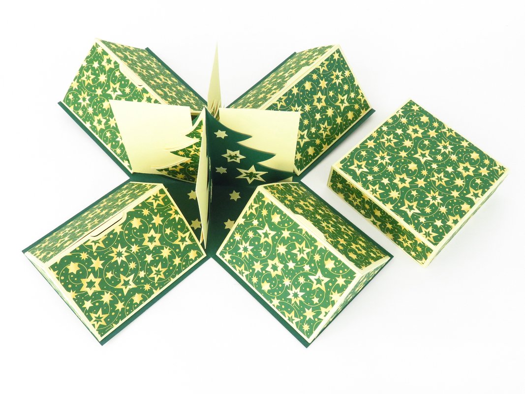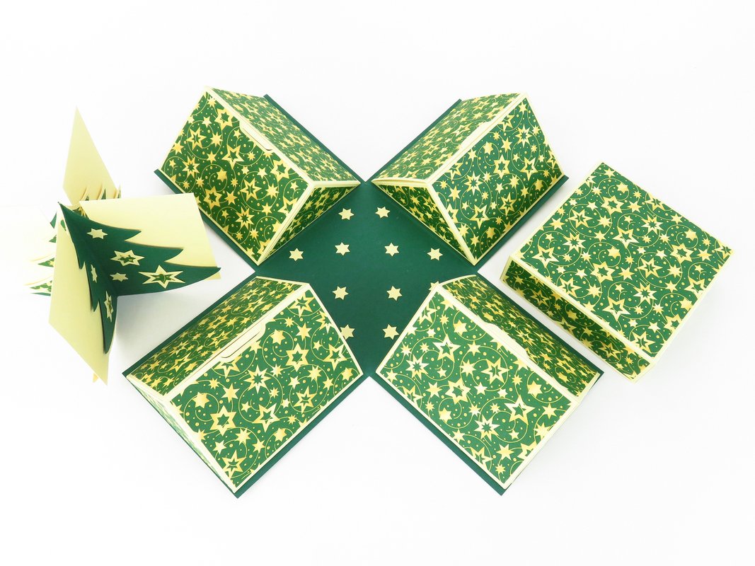 In dieser Box kannst du ein paar Kleinigkeiten wie Süßigkeiten oder kleine Sammelobjekte unterbringen. Außerdem gibt es hier ein Tannenbäumchen mit vier kleinen Taschen, in die du entweder Geschenkarten oder kleine Kärtchen mit Glückwünschen oder anderem persönlichen Text stecken kannst.