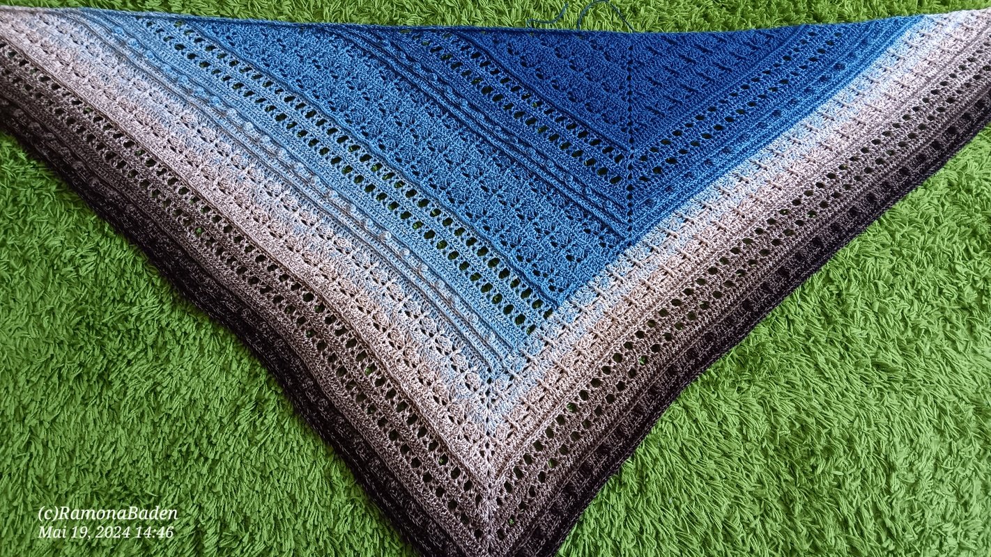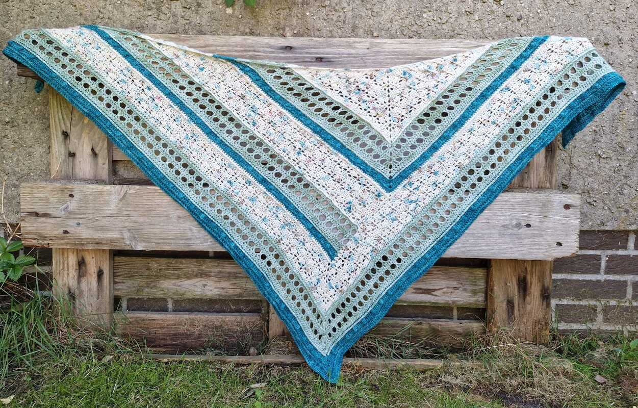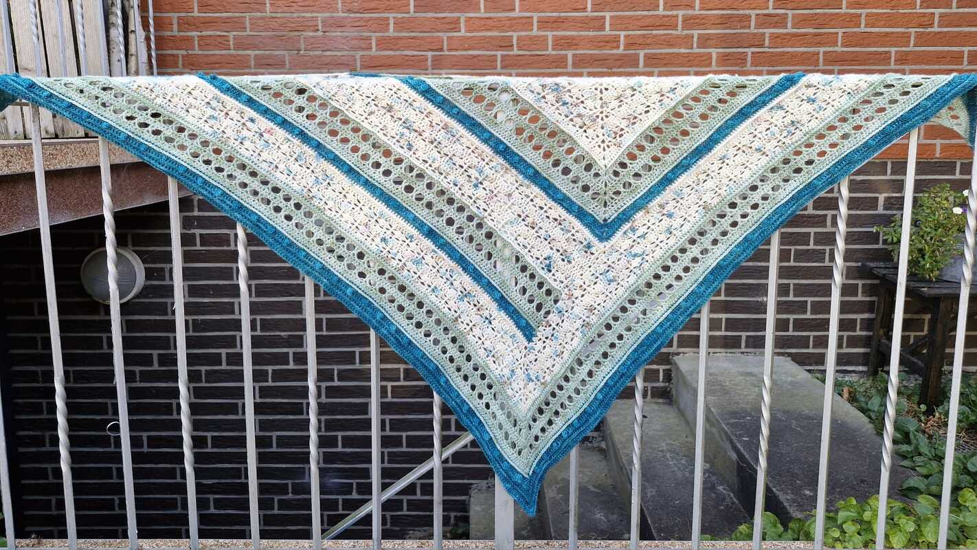 Ihr solltet alle gängigen Maschen häkeln können, sowie auch Popkornmaschen, Reliefstäbchen und Kreuzstäbchen. Letztere werden aber auch in der Anleitung nochmal ausführlich erklärt, mit Hinweis auf ein passendes Youtube Video, so das auch geübte Anfänger das Tuch nacharbeiten können.