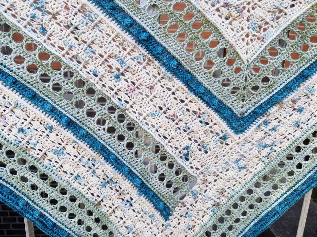 Ihr solltet alle gängigen Maschen häkeln können, sowie auch Popkornmaschen, Reliefstäbchen und Kreuzstäbchen. Letztere werden aber auch in der Anleitung nochmal ausführlich erklärt, mit Hinweis auf ein passendes Youtube Video, so das auch geübte Anfänger das Tuch nacharbeiten können.