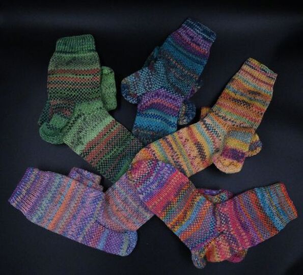 Verwendetes Garn: Es kann jedes Garn in Sockenwollstärke verwendet werden. Industriesockengarne wie das Opal-Abo haben einen anderen Effekt, als handgefärbte Garne. Auch Reste kann man hier Prima verarbeiten. Für Größe 46/47 hat z.B. eine Teststrickerin insgesamt knapp 100g verbraucht, also etwa 50g pro Farbe.