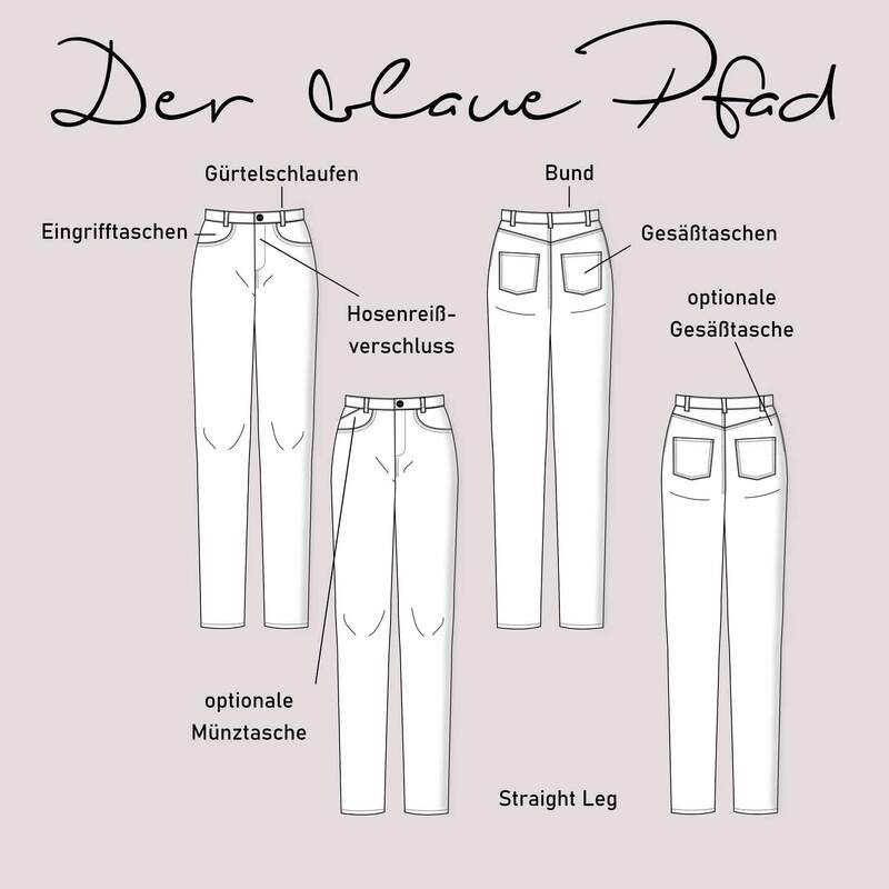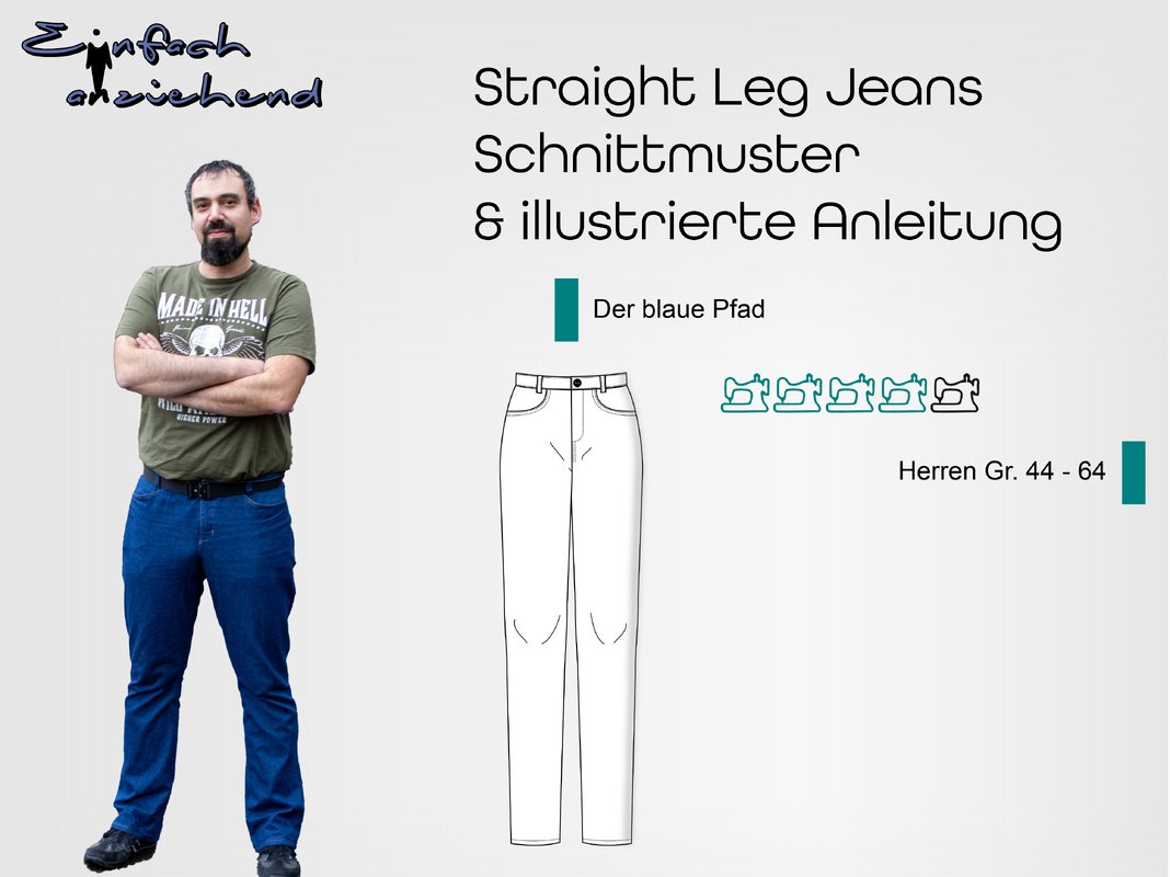 Dieses Schnittmuster für eine Herren Straight Leg Jeans aus Jeansstoffen mit max. 3% Elasthan und 2 zusätzlichen Taschenoptionen für einen klassischen und eine besonders praktische Hose, trägt den schönen Namen "Der blaue Pfad". Das Schnittmuster beinhaltet natürlich eine ausführliche Anleitung und die Herren Normalgrößen 44 - 64.