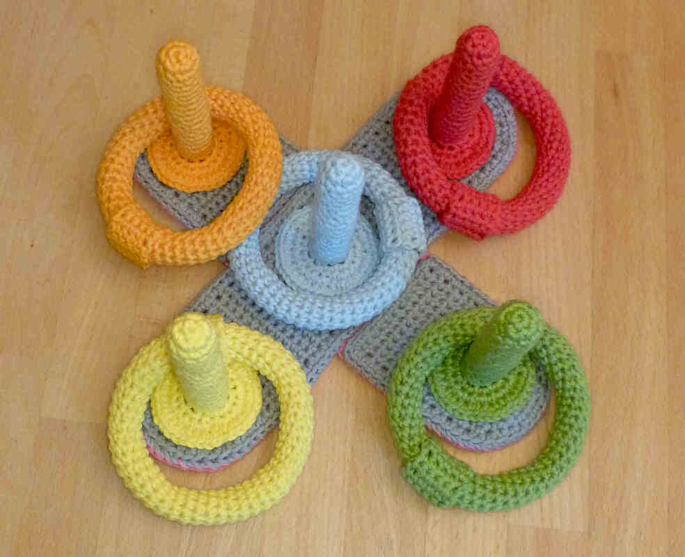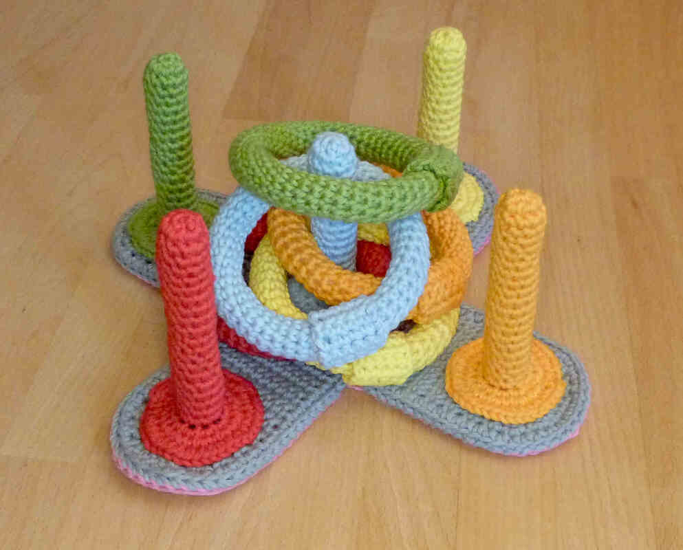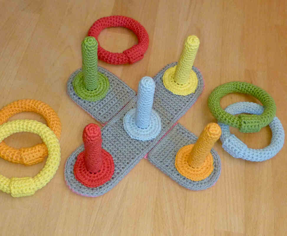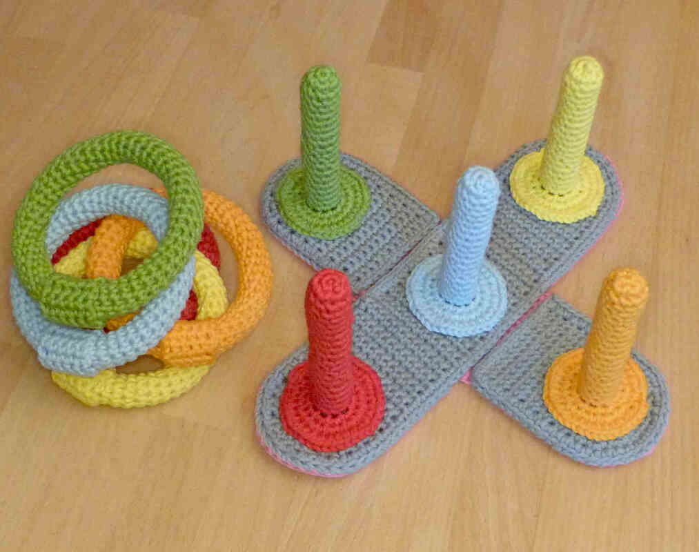 Besonders für Kleinkinder ist gehäkeltes Spielzeug sehr praktisch. Es ist gut zu greifen, geht nicht kaputt, wenn es runterfällt, schont Möbel und Fußböden und es macht keine Geräusche wie z.B. Spielzeug aus Holz oder Plastik. Mit dem Ringwurfspiel, das auch sehr gut im Kinderzimmer gespielt werden kann, lernen die Kleinsten spielerisch Farben zu erkennen und zu benennen und erstes Regelverständnis. Gleichzeitig trainieren sie ihre Motorik, Auge-Hand-Koordination und Kommunikation.