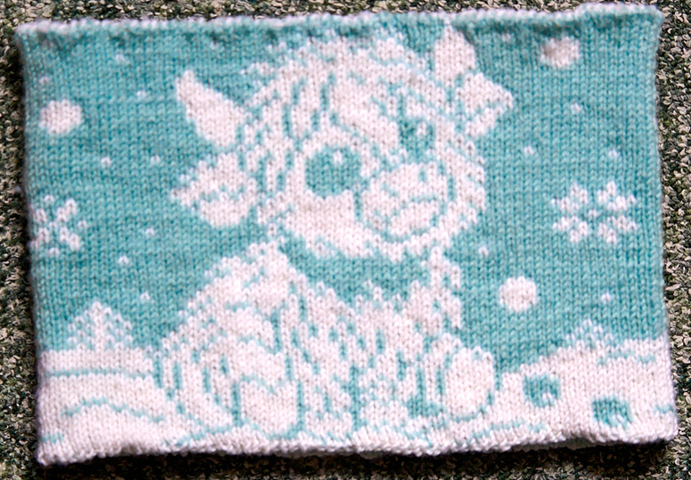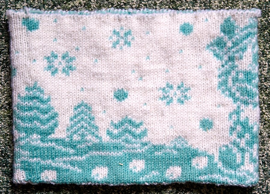 Mit einer 3mm-Rundstricknadel (80cm) verstrickte ich ein Garn, das eine Maschenprobe auf 10 x 10 cm von 28 Maschen x 36 Reihen ergibt. Mit diesem wurde der Schal einfach gemessen etwa 24,5 cm breit (Umfang: 49 cm) und 17 cm hoch. Durch Wiederholen der ersten und letzten Reihe kann die Höhe noch variiert werden.