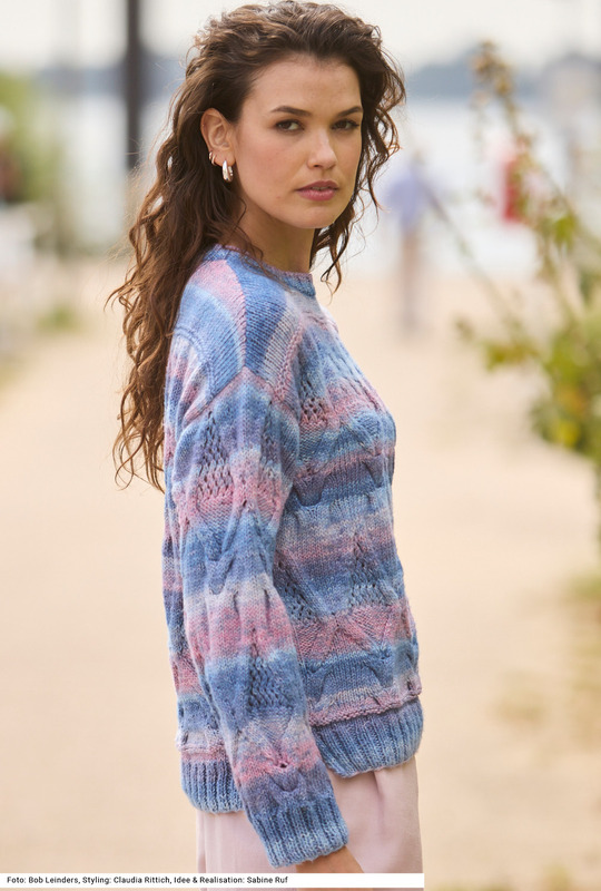 Dieser lässig geschnittene Pulli ist ein wunderbares Beispiel dafür, wie mit Verlaufsgarnen (aus Baumwolle und Viskose) überaus harmonische und stilvolle Farbübergänge gelingen können – das wirkt sehr beschwingt. Unterstrichen wird der lebendige Charakter durch ein spannendes Rauten-Zopf-Lochmuster, das versierte StrickerInnen erfreuen wird und Aufmerksamkeit beim Stricken erfordert. Dafür ist der Schnitt recht einfach, die Ärmel werden gerade eingesetzt, sodass man nicht viel Arbeit beim Einnähen hat. Alle Bündchen und die Ausschnittblende werden im 2/2-Rippenmuster gearbeitet. Eine Anleitung gibts für die Größen 38/40, 44/46 und 50/52.